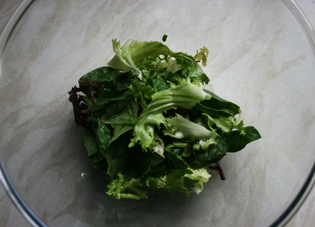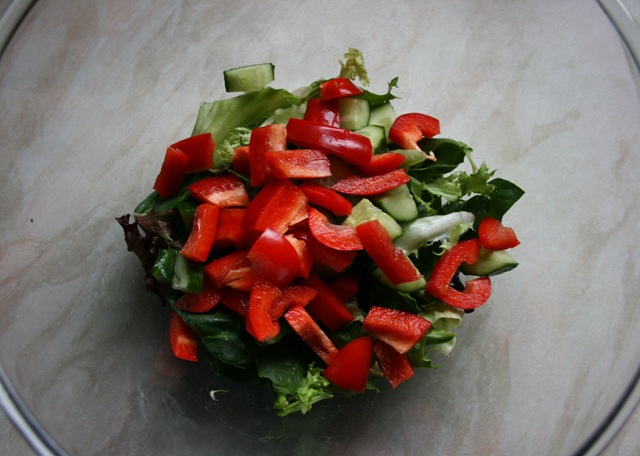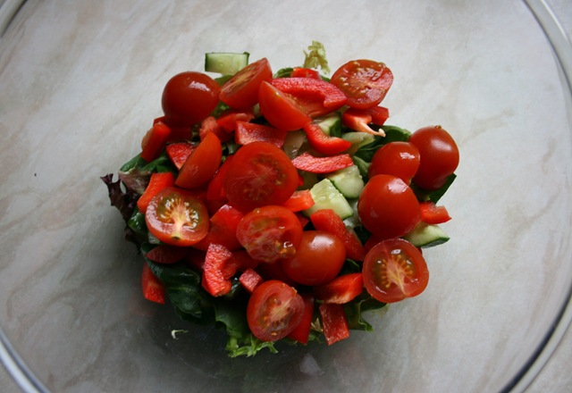 6. Pour the dressing over the salad vegetables and toss together. Drizzle a bit more olive oil into the bowl, if it is needed.