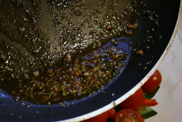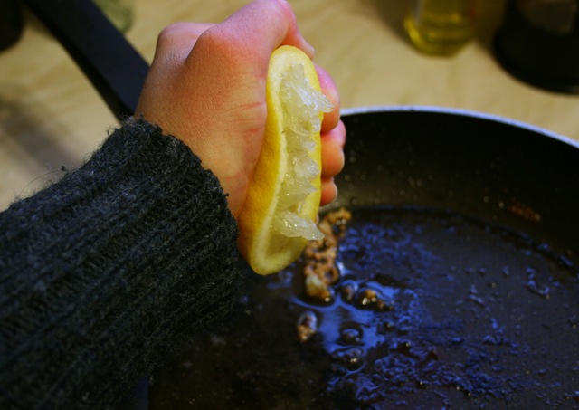 5. For the dressing, fry the crushed or diced garlic in the leftover hot oil in the pan for a couple of minutes until just starting to go a golden brown colour. Remove the pan from the heat and add the lemon juice, oregano, pepper and (if using) salt to the pan and stir together.