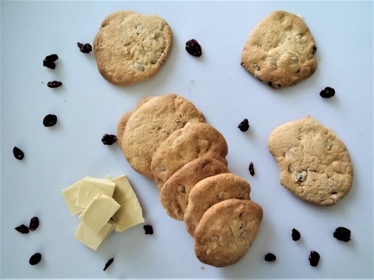 A few weeks ago, in the glorious days of Level 1 in everywhere in New Zealand, we joined a couple of other families at a friend’s house for lunch after church. We all did quick supermarket runs to get food to take and share and one of the things that someone else brought was a packet of dark chocolate and cranberry biscuits, which it turned out were particular favourites of a number of people in the church. Sadly the biscuits were normal, gluten-filled biscuits and I never got to taste them but the gauntlet was laid down – could I reproduce those delicious-sounding biscuits in a gluten-free version that was as tasty as the gluten version. I was fully up for the challenge, and my husband, who had tasted the gluteny biscuits, was up for the challenge of providing feedback on my creations to tell me how close I was to the benchmark set by the bought biscuits. We both prefer white chocolate, so once I’d come up with a recipe involving dark chocolate I just swapped it for white chocolate. Feel free to use any colour chocolate you like, or a mix of different kinds of chocolate.