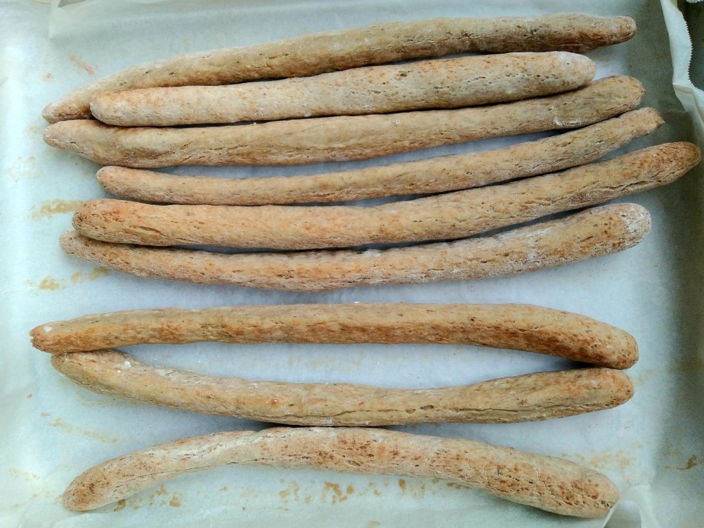 4. Cover the bread sticks with a damp cloth and set aside somewhere warm to rise for about half an hour. Towards the end of the rising time, turn the oven back on to 180°C to pre-heat again. Once the oven is not, bake the bread sticks in the middle of the pre-heated oven for about 30 to 35 minutes or until golden brown and done. Turn the bread sticks over about halfway through the baking time to ensure they brown all over. While still hot and in the pan in which they were baked, drizzle a little bit of the extra olive oil over the cooked bread sticks and then sprinkle them with salt (this is optional!). Spread the sticks on a cooling rack to cool a little and then enjoy!