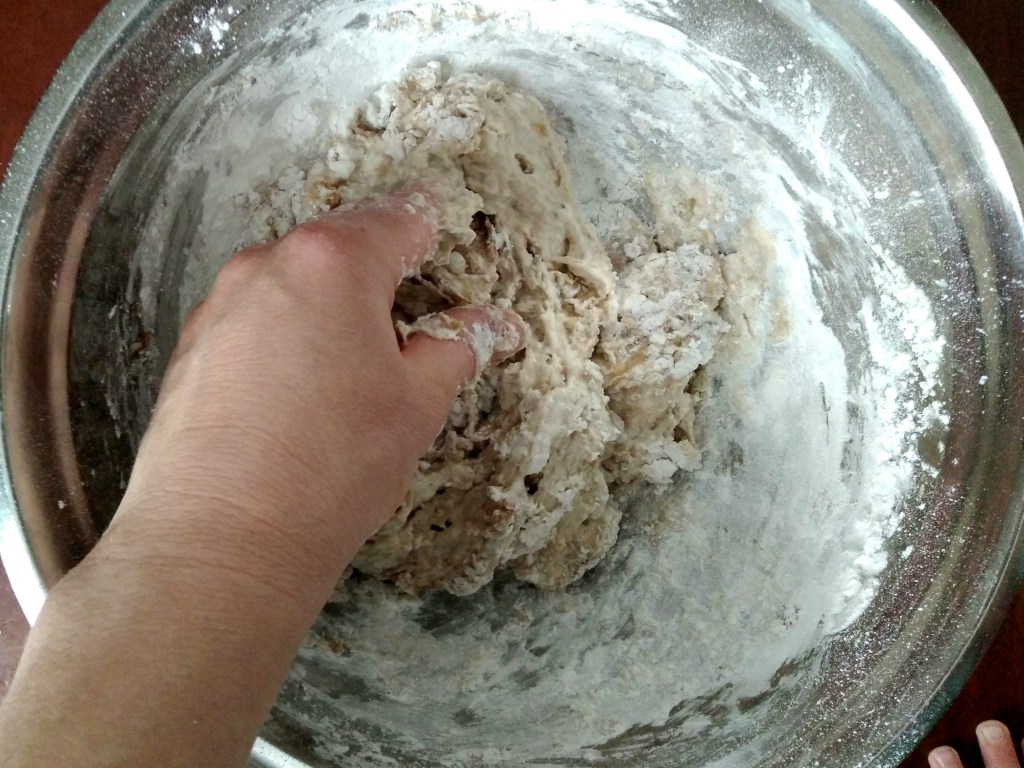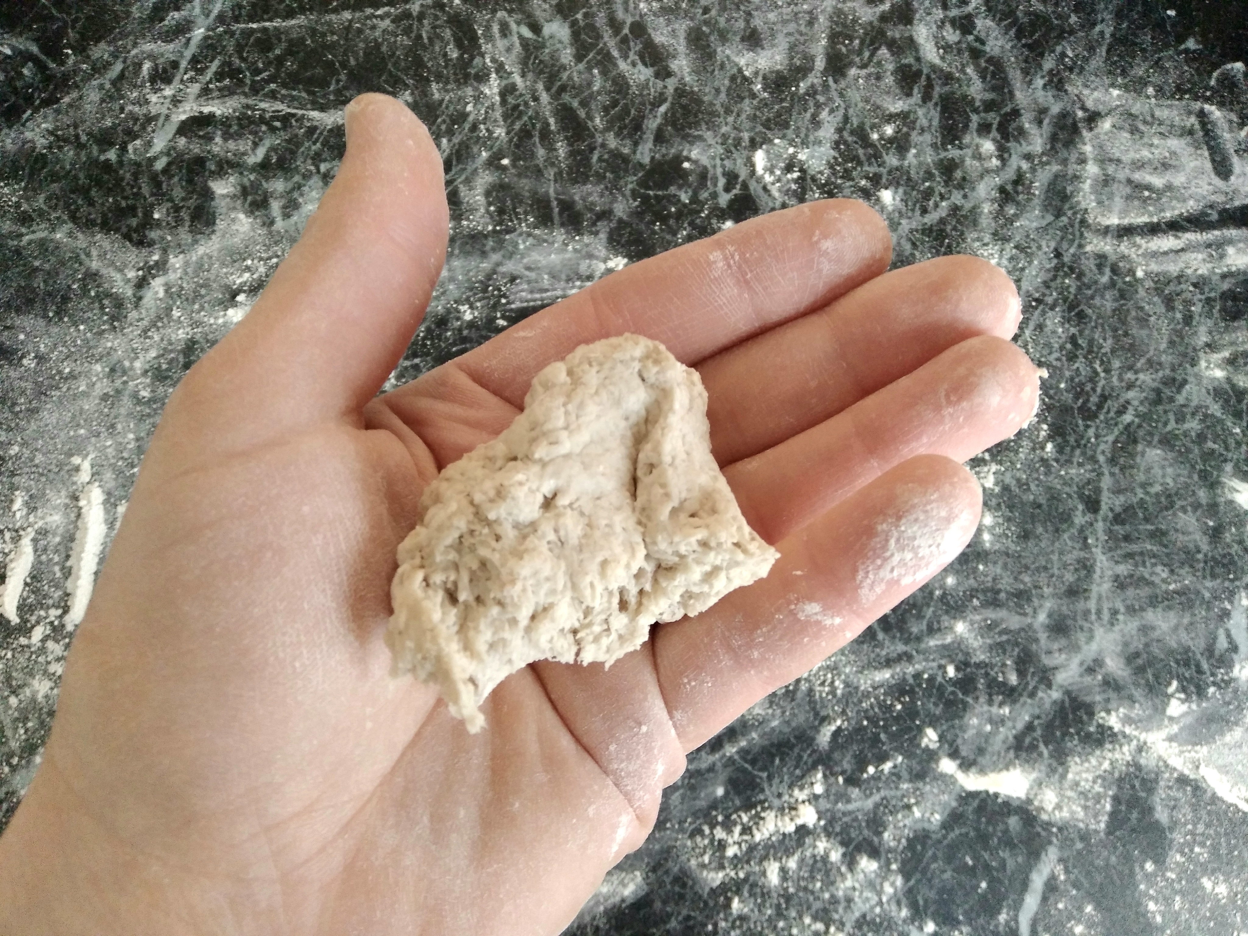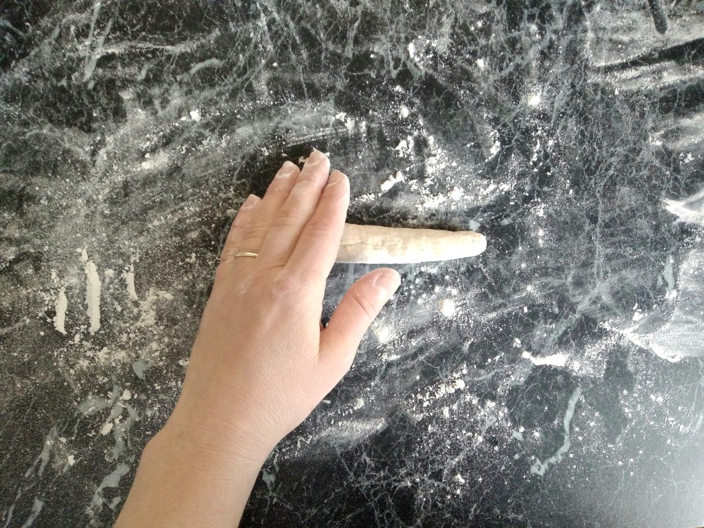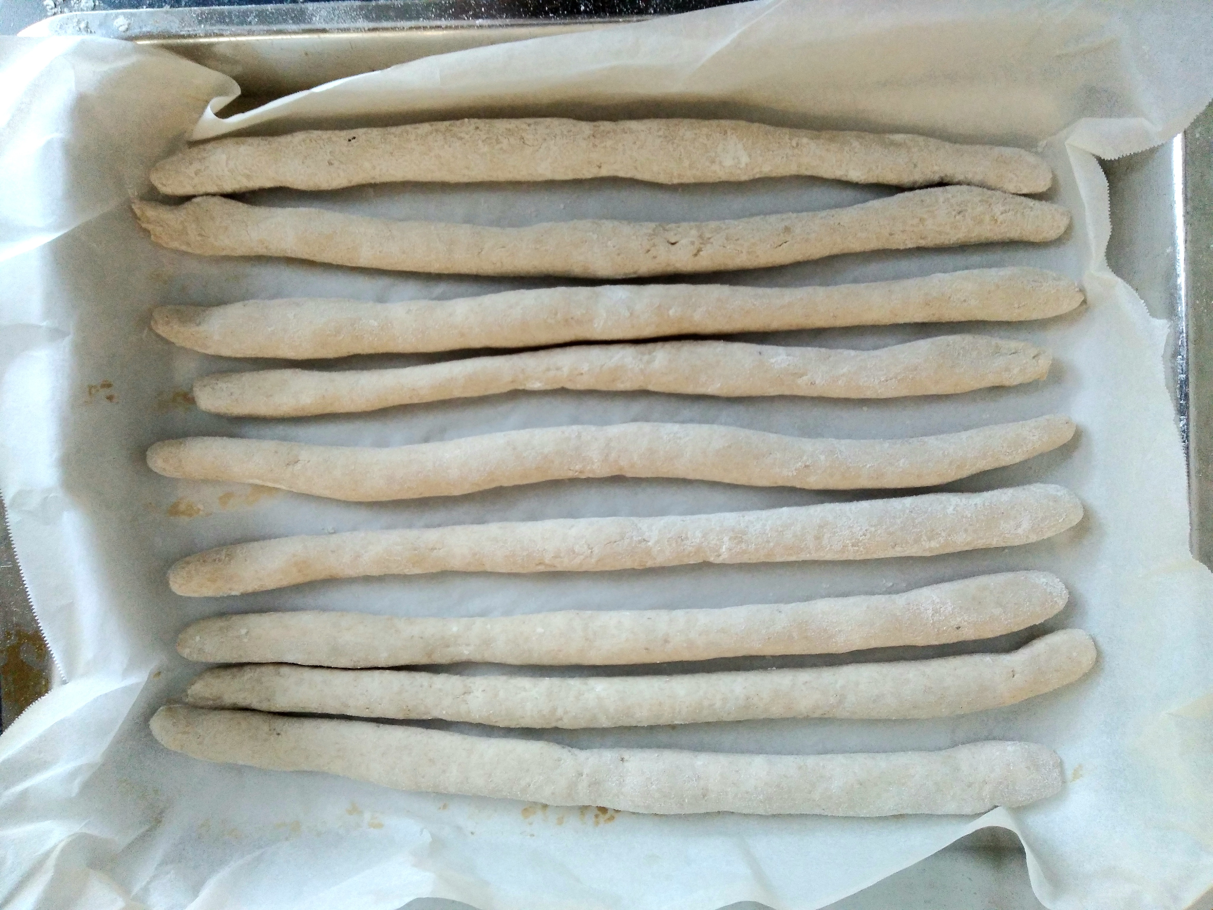 3. Once combined, generously flour a clean work surface with buckwheat flour and roll the dough into sticks. You may need to flour your hands to stop the dough sticking. I scooped up balls of dough that were about golf ball sized and rolled sticks that were about the diameter of my baby finger and about 30 cms long. As you finish rolling each breadstick, put them on a lined baking tray with at least a few millimetres between each stick.