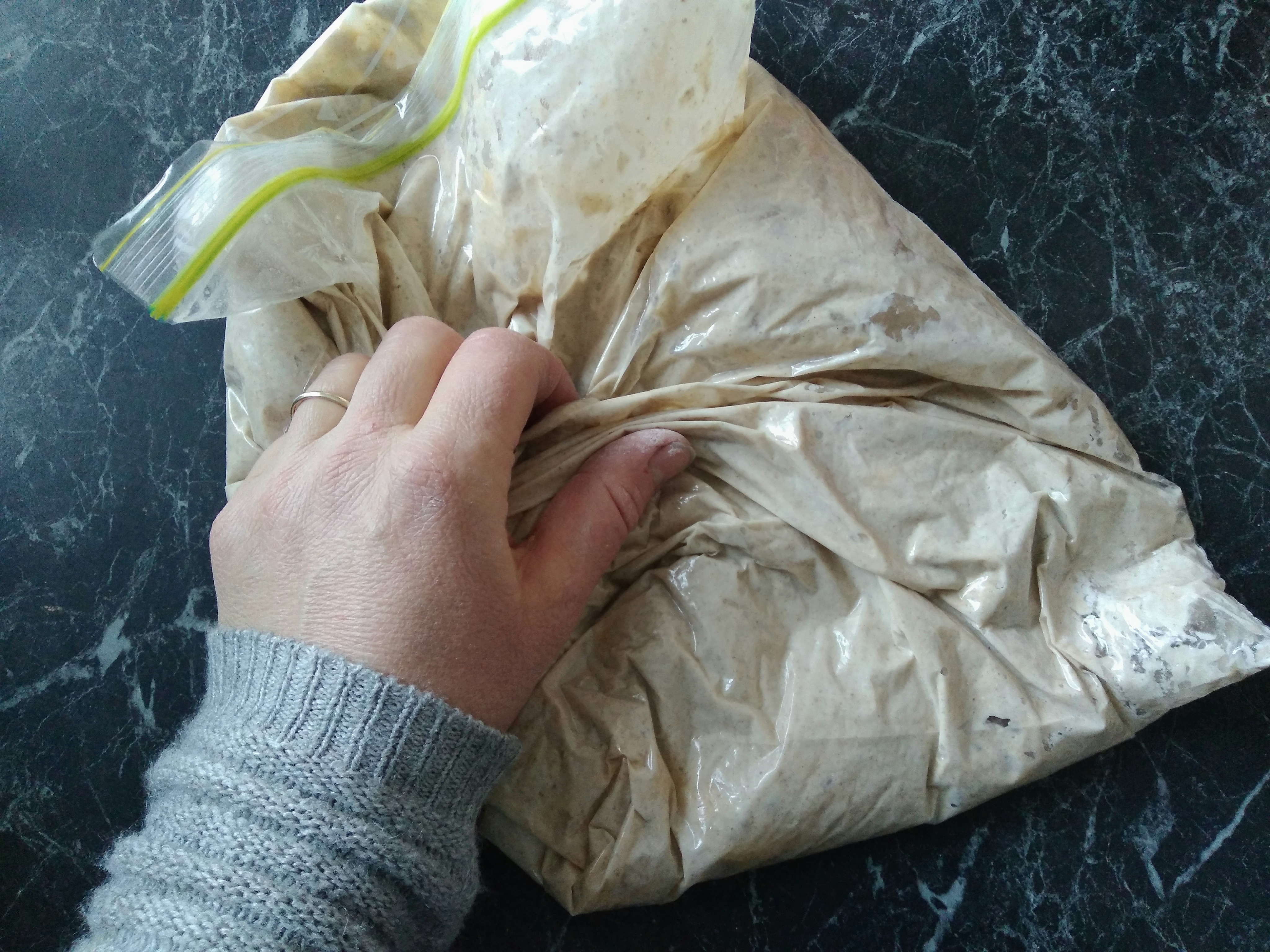 2. When you are ready to make the bread, add the eggs and water to the bag with the dry ingredients, reseal the bag with as much air removed as possible, and mix everything together well. I find it easiest to do this by almost massaging the outside of the bag until all the ingredients are fully mixed together. If you are making this in a bowl, add the eggs and water to the dry ingredients and mix together thoroughly with a whisk, wooden spoon or even your hands if that works best for you!
