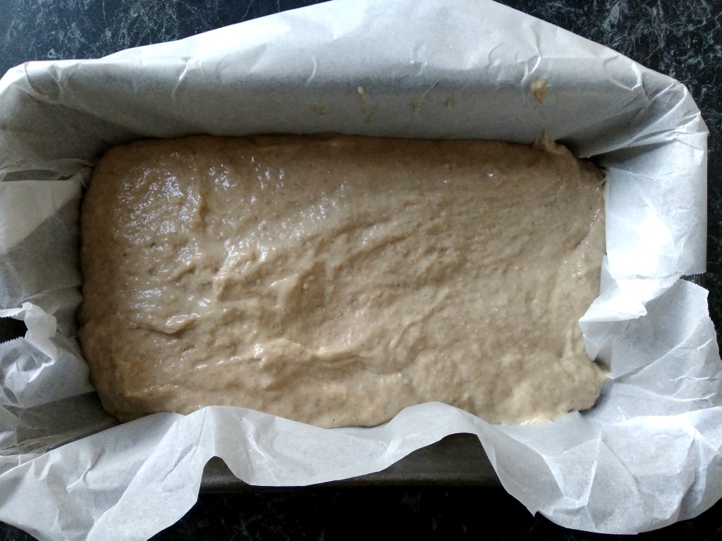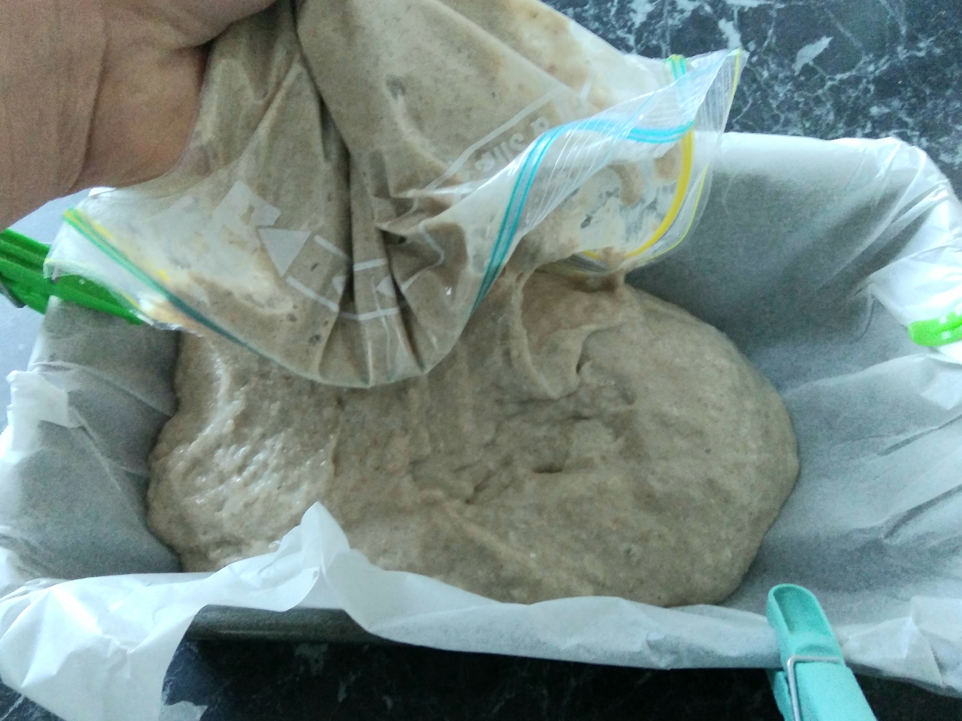 3. Line a loaf tin with baking paper and carefully squeeze the bread mix out of the bag into the lined tin. I find it easiest to do this by opening the bag upside down into the tin and then squeezing the bag from the closed end to the open end. If you are making this in a bowl, this step will be much easier – just scrape your bread mix into the lined loaf tin!