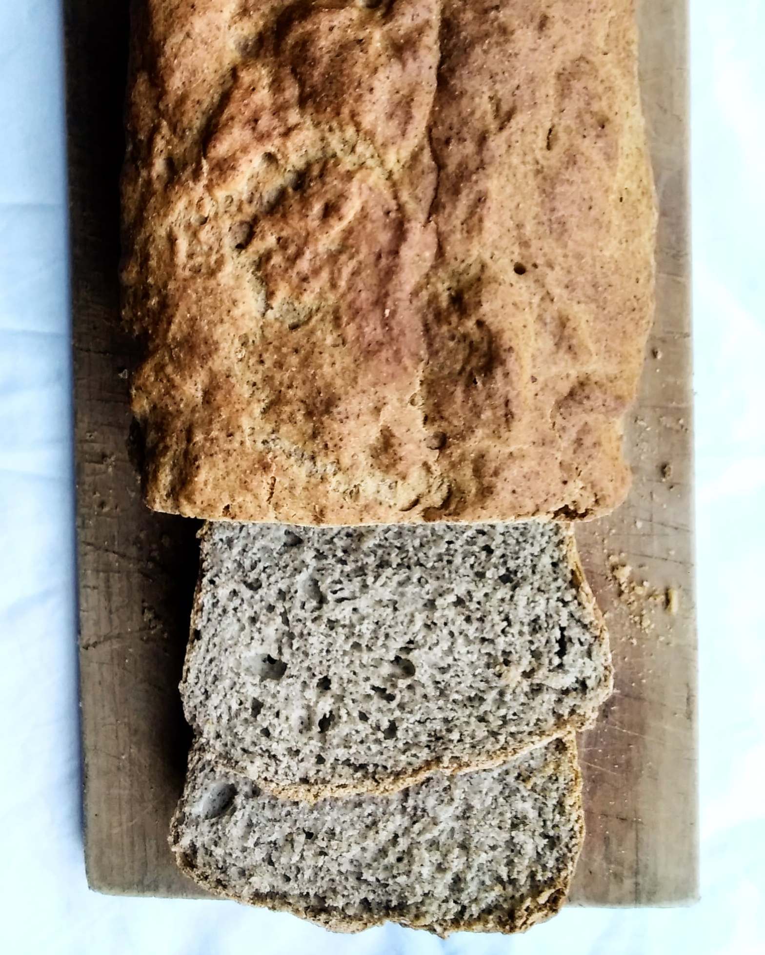 The taste is quite wholegrainy. This makes enough for one regular homemade bread loaf sized loaf and can be doubled without a problem if you want to make more in one go. If you use the optional seeds, you may need to put some of the batter in a second tin, or make sure you put the loaf into the oven before the batter rises too close to the top of the tin to ensure it doesn’t spill over in the oven. Like a lot of homemade gluten free bread this is great as bread on the day it is made. At a push, it can be used as bread the following day but is best toasted from day 2 onwards! When measuring gluten free ingredients in cups, it is better to spoon them into the measuring cup and then level off the cup with a butter knife than to scoop them straight into the cup.