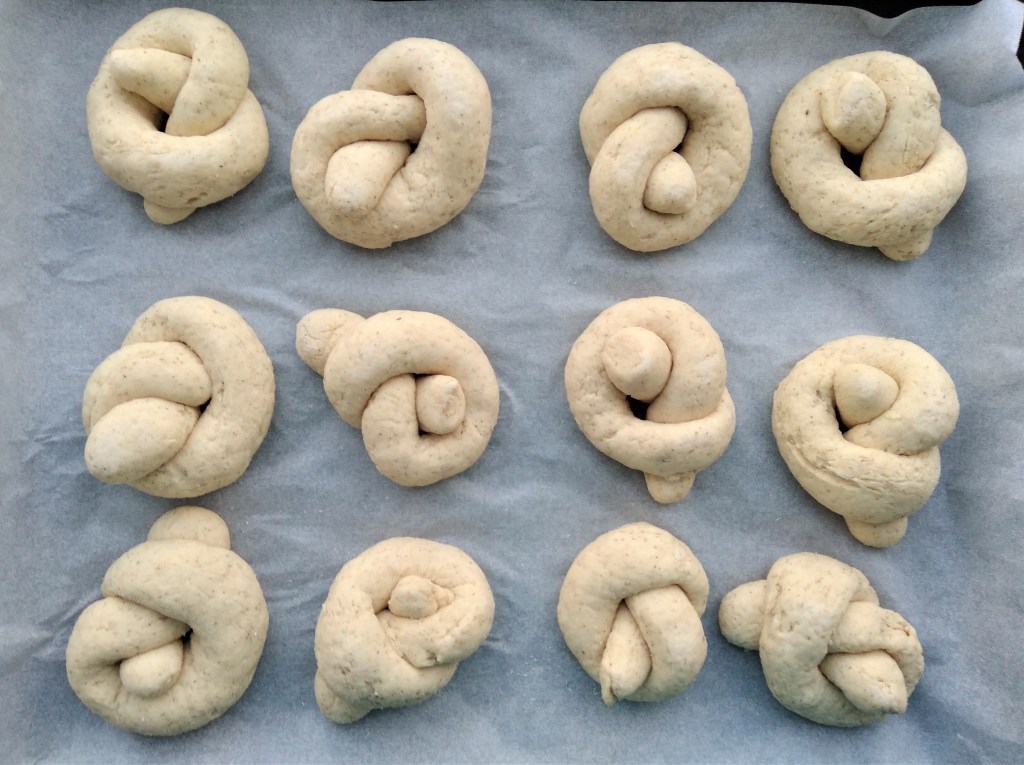 4. Place the shaped rolls on a lined baking tray, slightly apart to allow room for expansion, cover with a damp cloth and leave somewhere warm to rise. The dough should rise to about 1.5 to 2 times its original volume. The amount of time this takes will depend on how warm the environment is – I find it usually takes about half an hour somewhere warmish and draft-free.