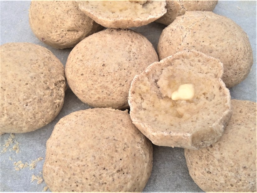 As with most gluten free breads, these rolls are best served on the day they are made. They are fantastic while still a bit warm from the oven and spread thickly with butter. The inside is soft and fluffy (and can be rolled into little balls – an indicator of gluten or gluten-like bread according to one of my sons!) and the outside is crusty and crisp when still warm. This recipe makes about 12 rolls that can be shaped according to your preferences. As usual the cup measurements below are based on a 250 ml cup as equal to 1 cup. Don’t be put off by measuring your own flours and starches – this is literally one bowl and everything in this recipe should be available in most supermarkets with a good selection of gf baking products.