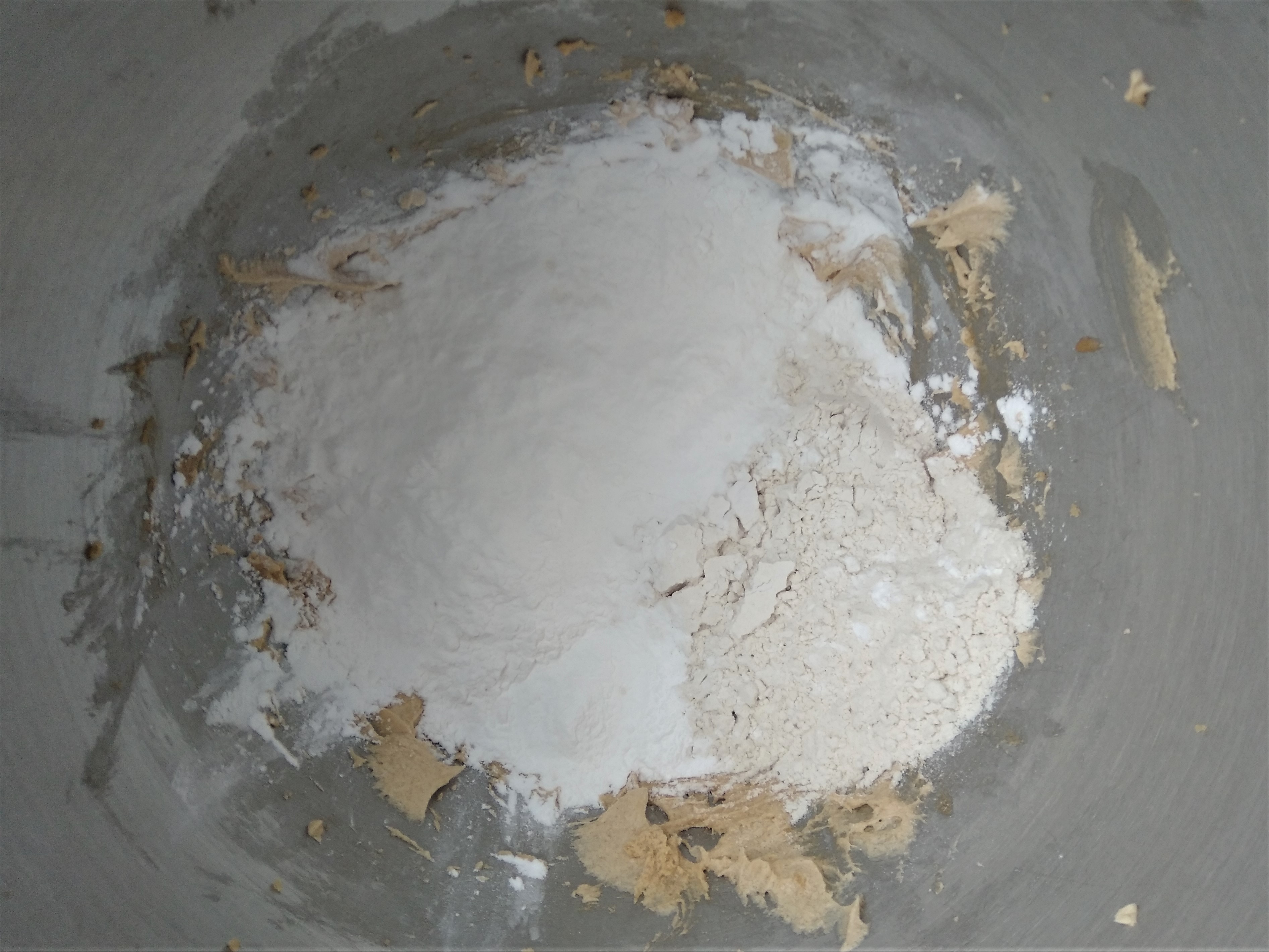 3. Sift the starches, flours, salt and baking powder into your mixing bowl and mix thoroughly into the butter/sugar/egg mixture.
