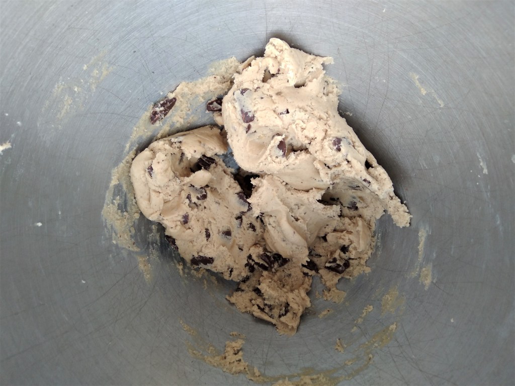 4. Add the chocolate chips to your mixing bowl and fold thoroughly through the biscuit mixture.