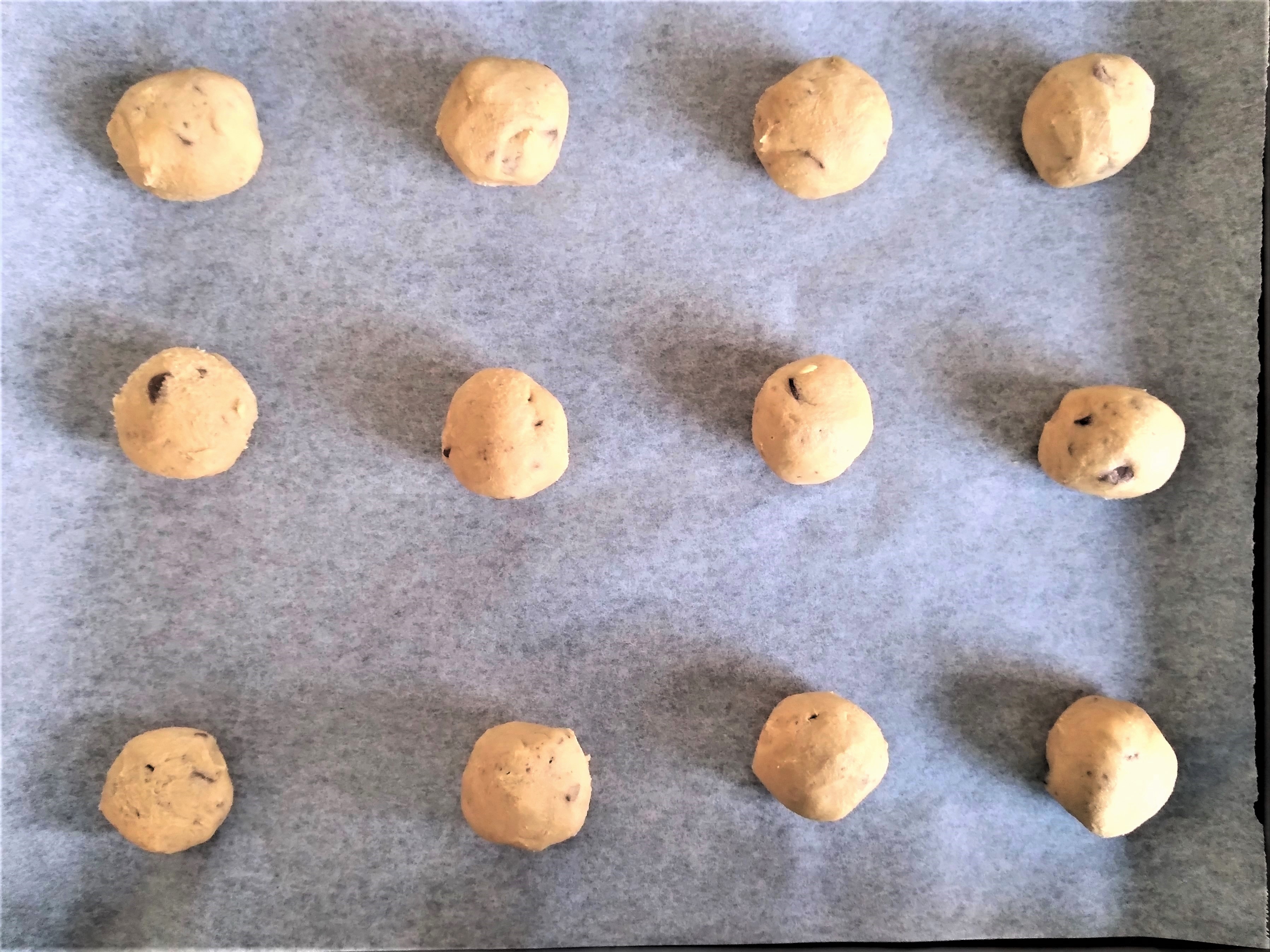 7. Remove the bowl of biscuit dough from the fridge and, taking a generous teaspoon of mixture at a time, roll the dough into small balls. Place the biscuit dough balls on the lined baking tray, spaced at least an inch apart to allow for them to spread.