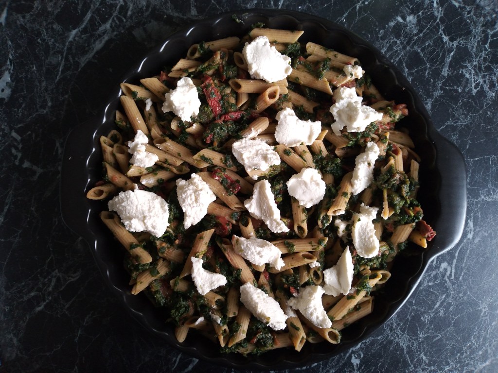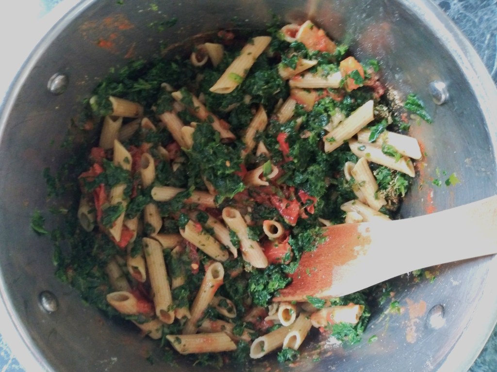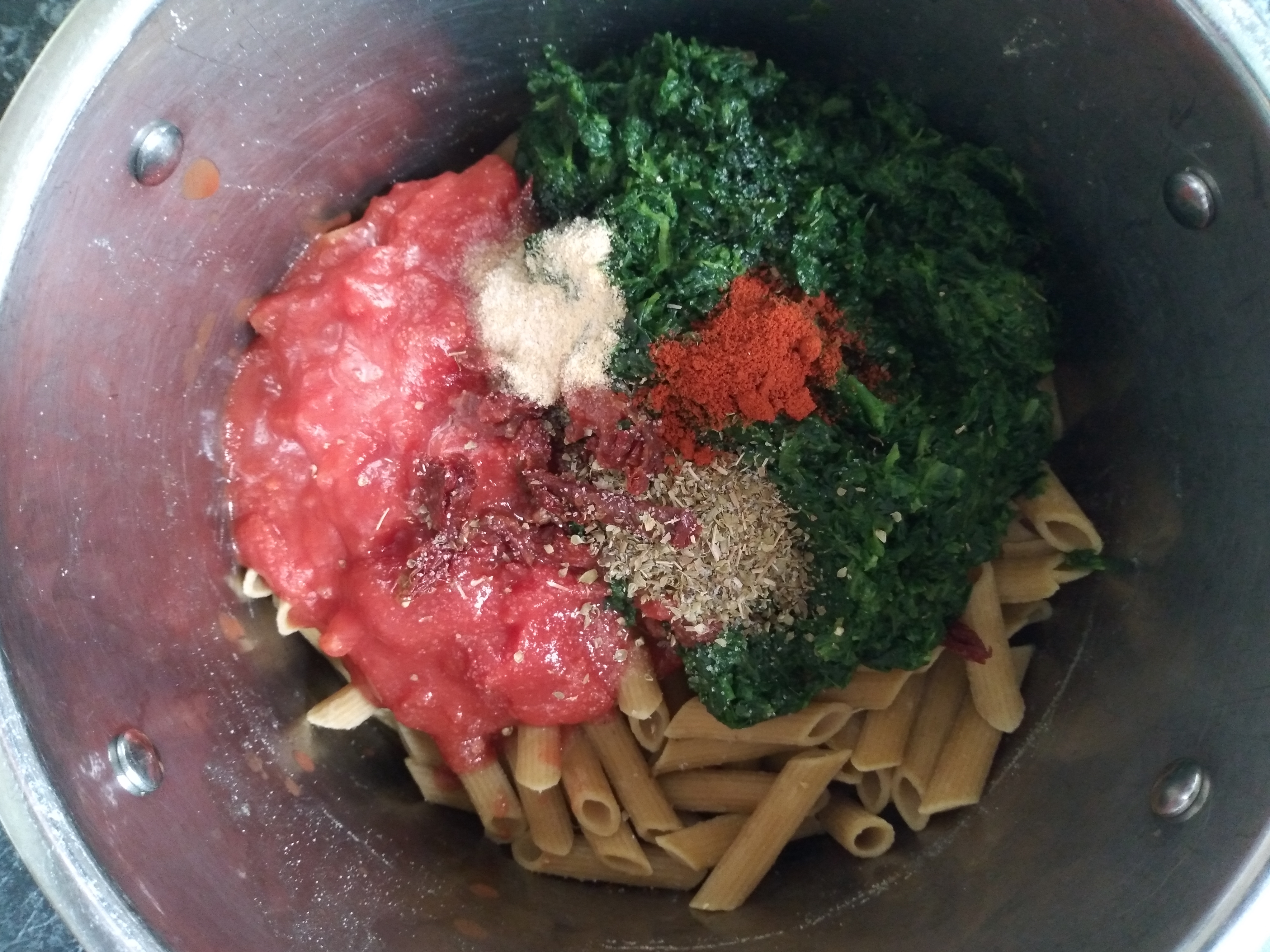 3. Drain the pasta and return it to the pot. Add the spinach, tinned tomatoes, sundried tomatoes, smoked paprika, garlic powder, oregano and salt to the pot and stir together until well combined. Be generous with the salt! Check the taste and adjust the seasonings as needed until you are happy with the flavour.