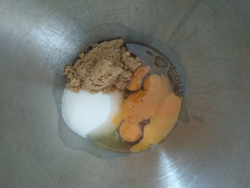 2. In a large bowl beat together the eggs, white sugar and brown sugar until very light, fluffy and pale. I do this with the whisk attachment in my stand mixer but beating well with a handheld electric mixer would also work.