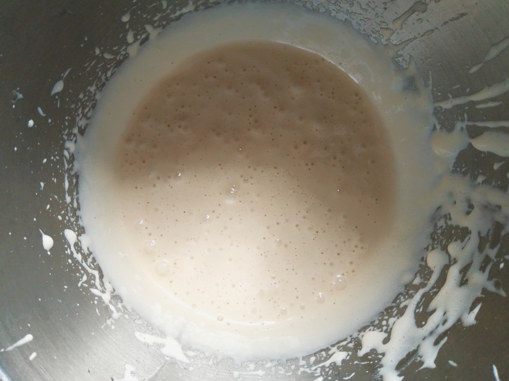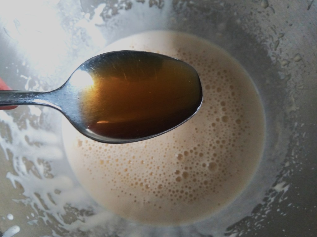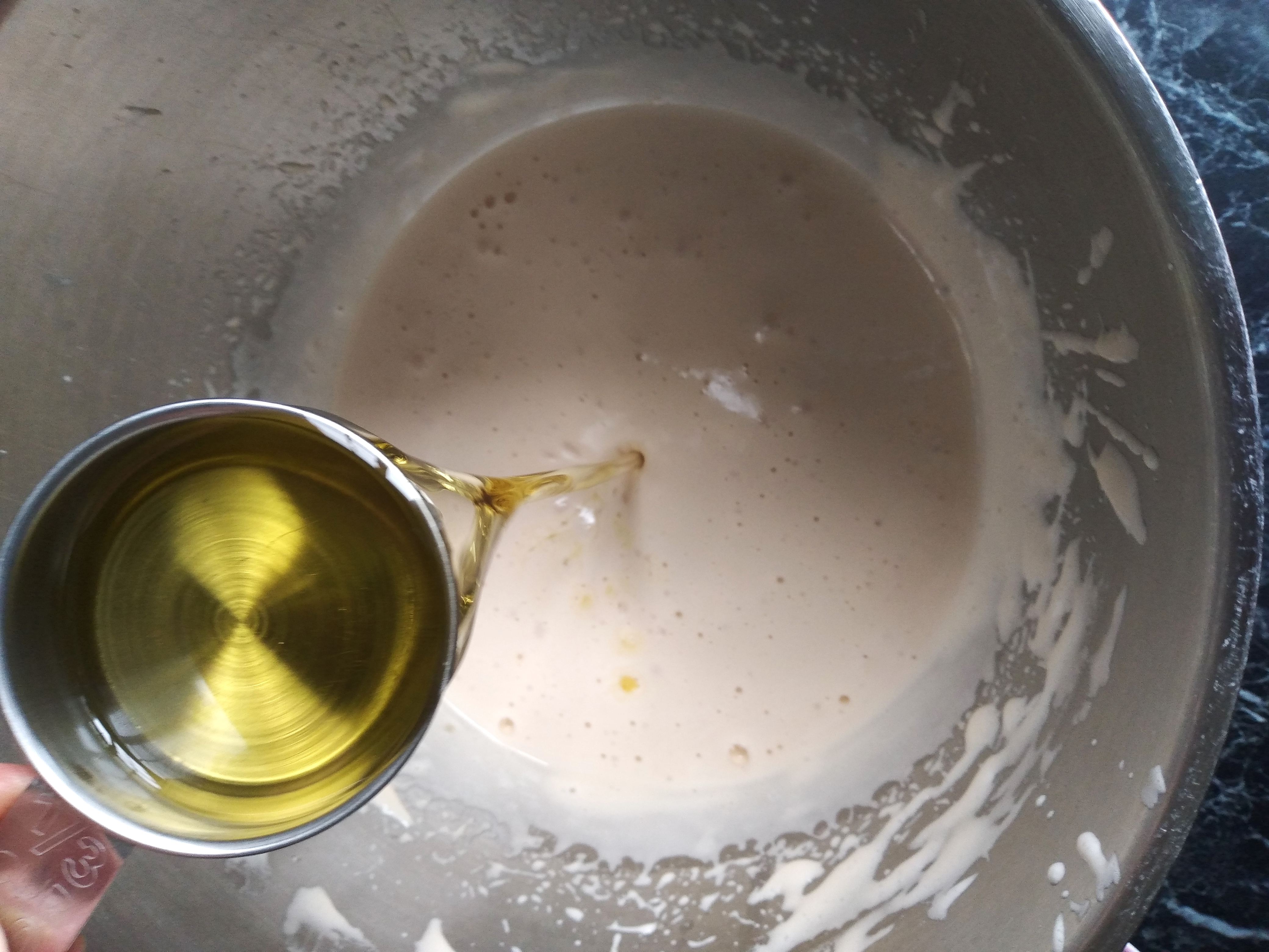 3. Add the vanilla essence, melted butter and oil to the bowl and carefully mix into the beaten egg and sugar, trying not to lose any of the air that has been incorporated into the egg/sugar mix.