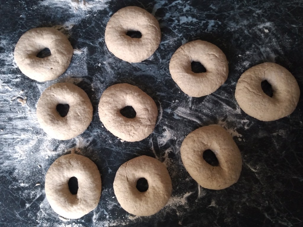 4. Divide the dough into 9 equal portions and shape each portion into a ring. To do this, roll the portion of dough into a ball between your hands and then swivel it between cupped hands on a well-floured work surface, before making a hole in the middle of the ball with a well-floured index finger. Expand the hole slightly by tugging the bagel apart gently with your hands, until you are happy with the shape. Hopefully the photos below will help explain the method better!