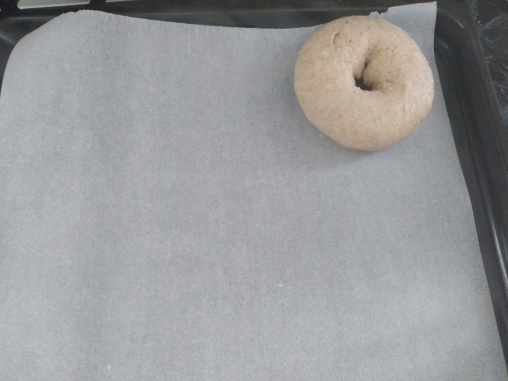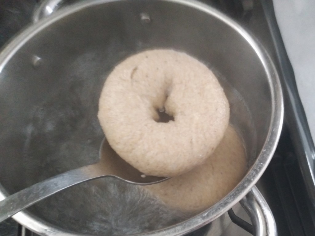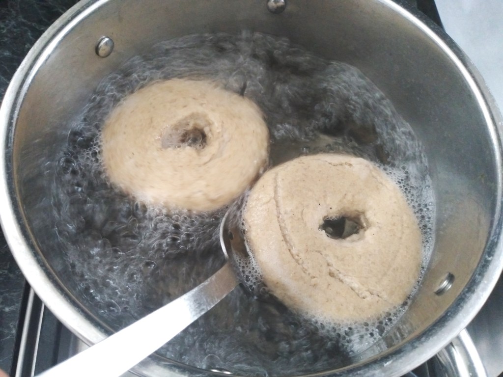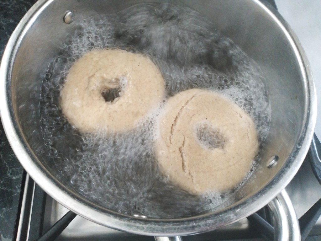 5. Once the dough has risen, pre-heat the oven to 220°C. Then, put a teaspoon of salt into a large saucepan, along with lots of boiling water, or boil the water in the pan. The amount of water will depend on the size of your pan – I think I used about 4 litres. Aim for the water to fill about two thirds of the pan. Heat the water until it reaches a vigorous boil (if you put boiling water into the pan, it will need to be heated back to a vigorous boil before you add the bagels). Then, using a slotted spoon, carefully put a couple of bagels into the water. The number of bagels per time will depend on the size of your pan, but err on the side of fewer rather than more bagels per time, so that they have sufficient space to float on the top of the water. Bear in mind the bagels will expand as they are boiled. Once the bagels have risen to the top of the water, boil them for a minute and then flip them with over with a spoon to spend a minute in the water on the other side. Then, carefully lift the bagels out of the water with a slotted spoon and place on to the lined baking tray. I found it best to put the side that was most recently in the water down on the pan. Repeat this process until all the bagels have been in the water.