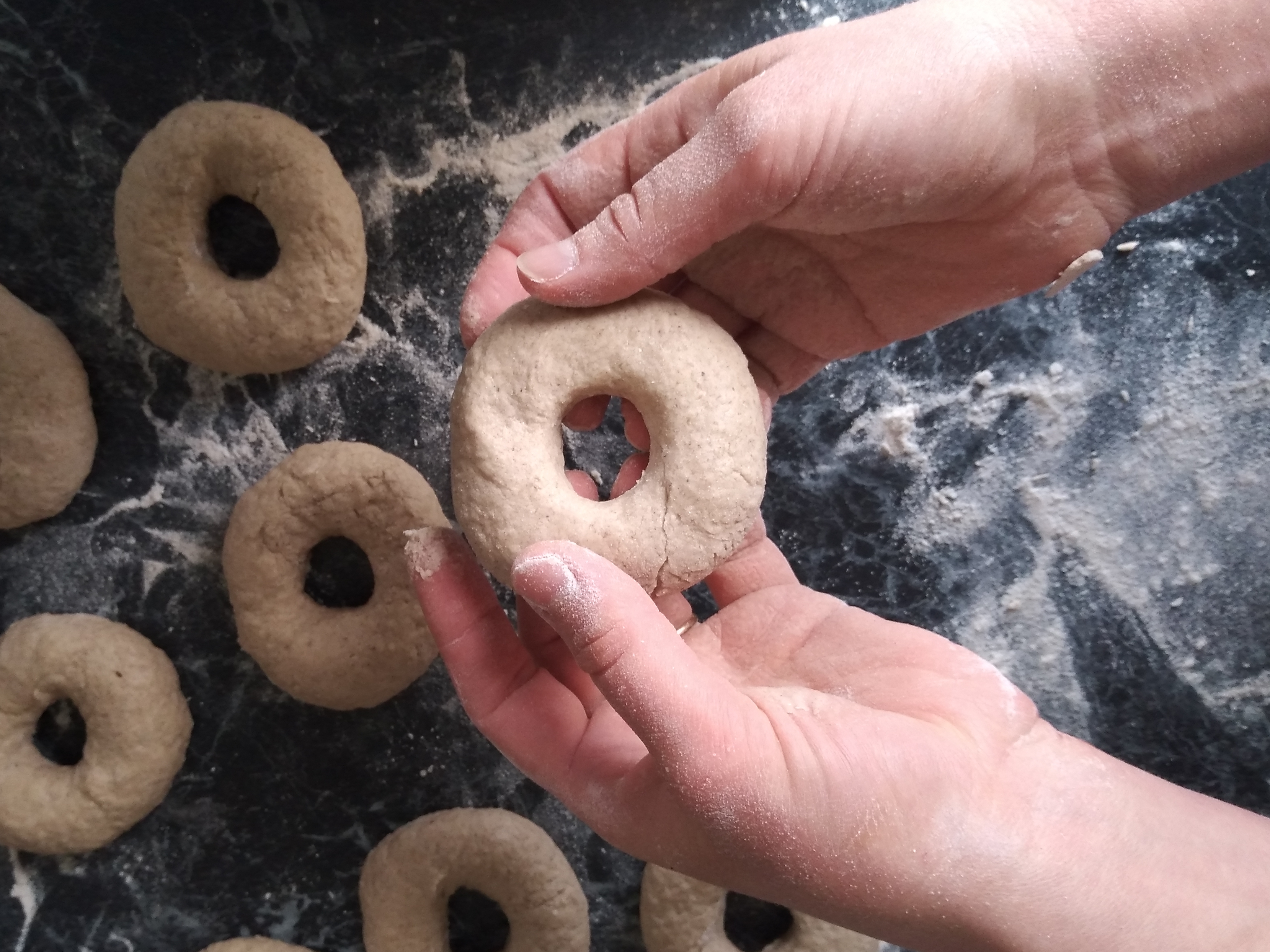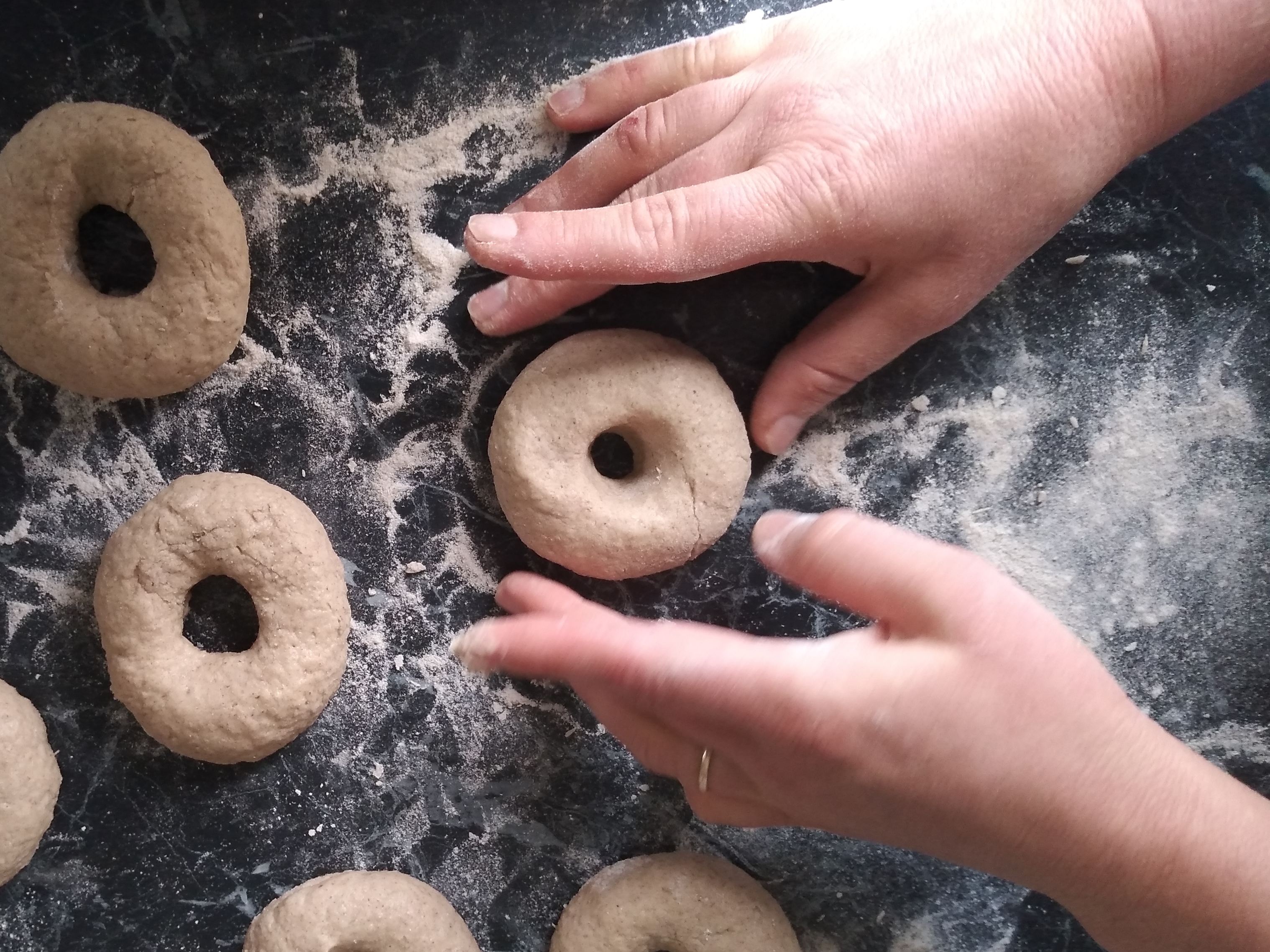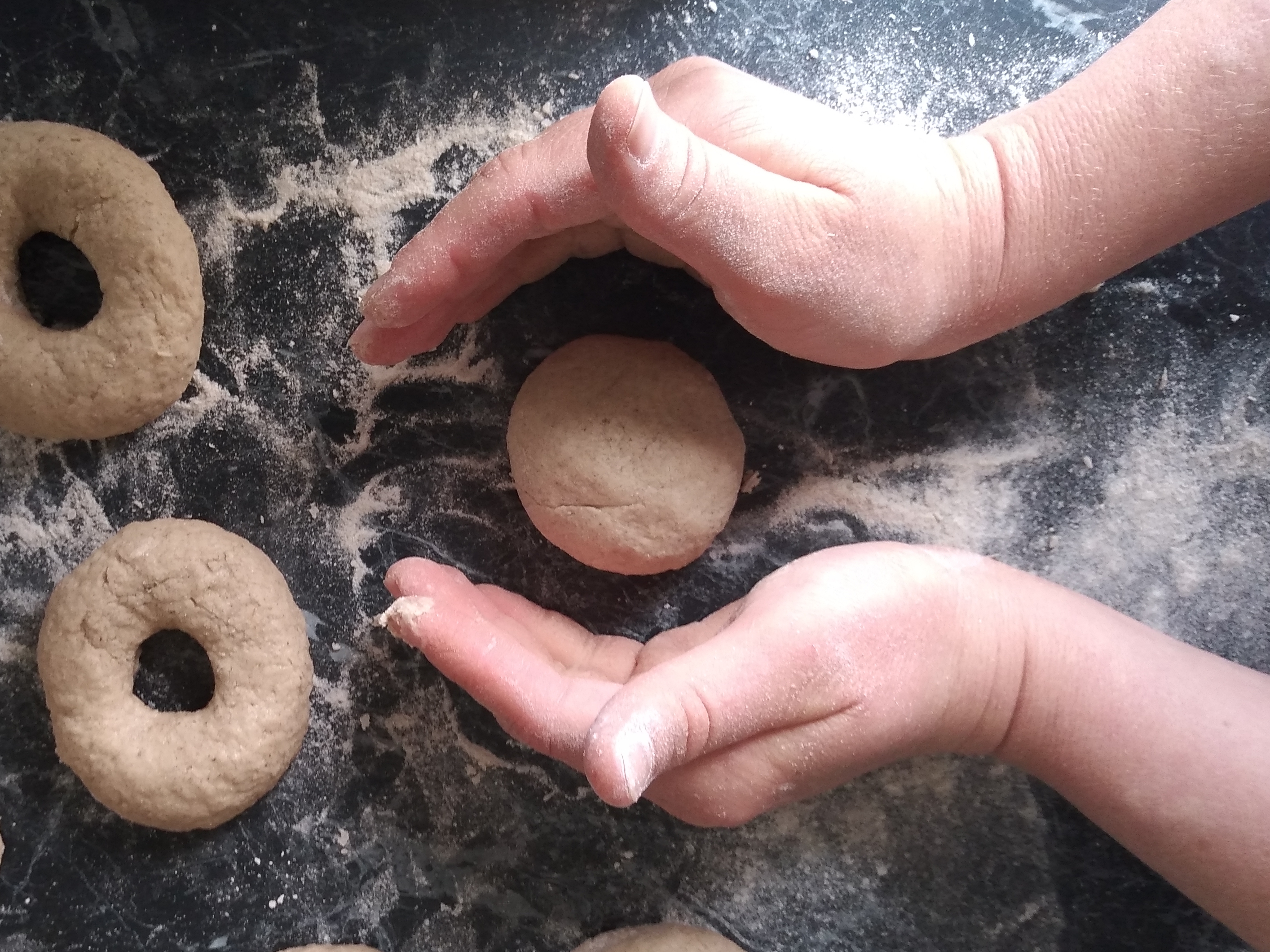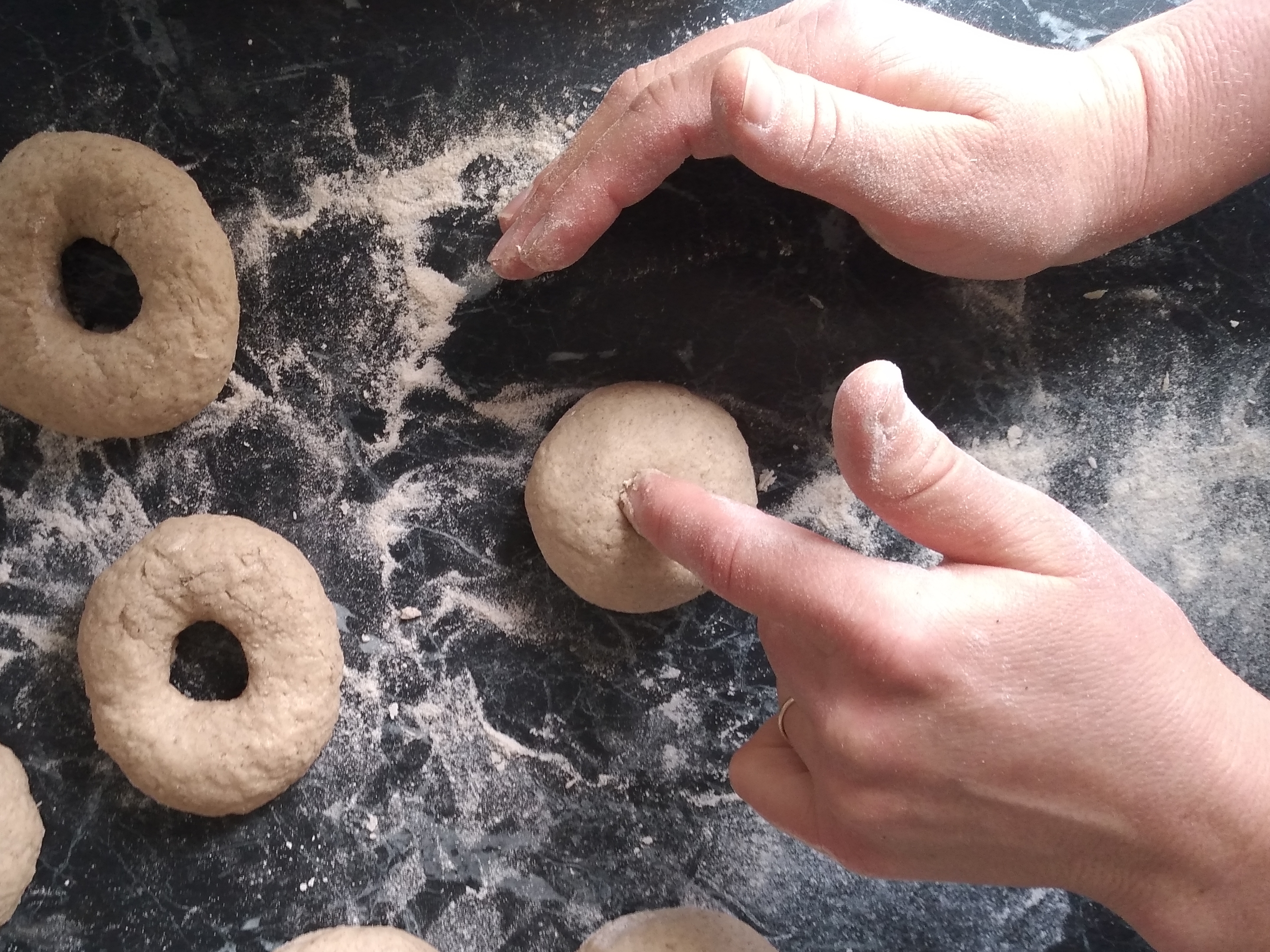 4. Divide the dough into 9 equal portions and shape each portion into a ring. To do this, roll the portion of dough into a ball between your hands and then swivel it between cupped hands on a well-floured work surface, before making a hole in the middle of the ball with a well-floured index finger. Expand the hole slightly by tugging the bagel apart gently with your hands, until you are happy with the shape. Hopefully the photos below will help explain the method better!