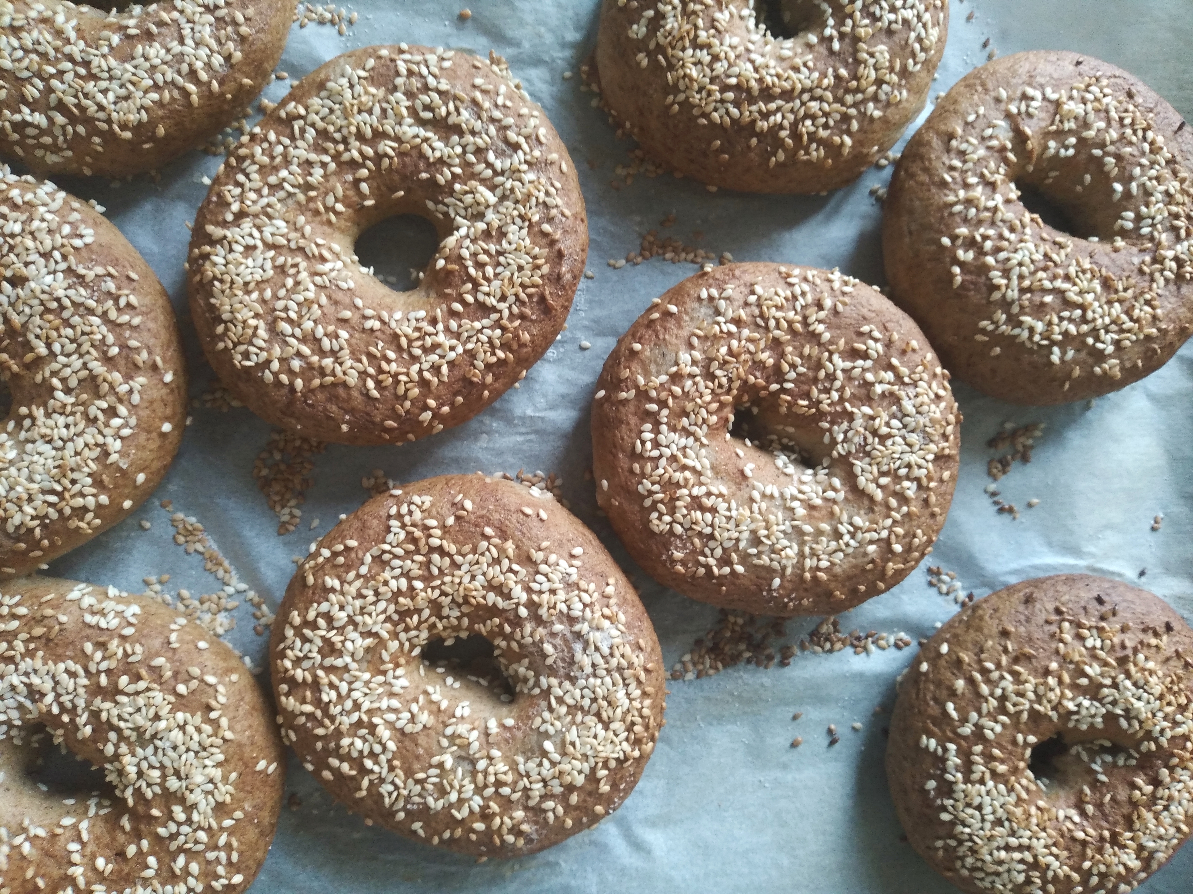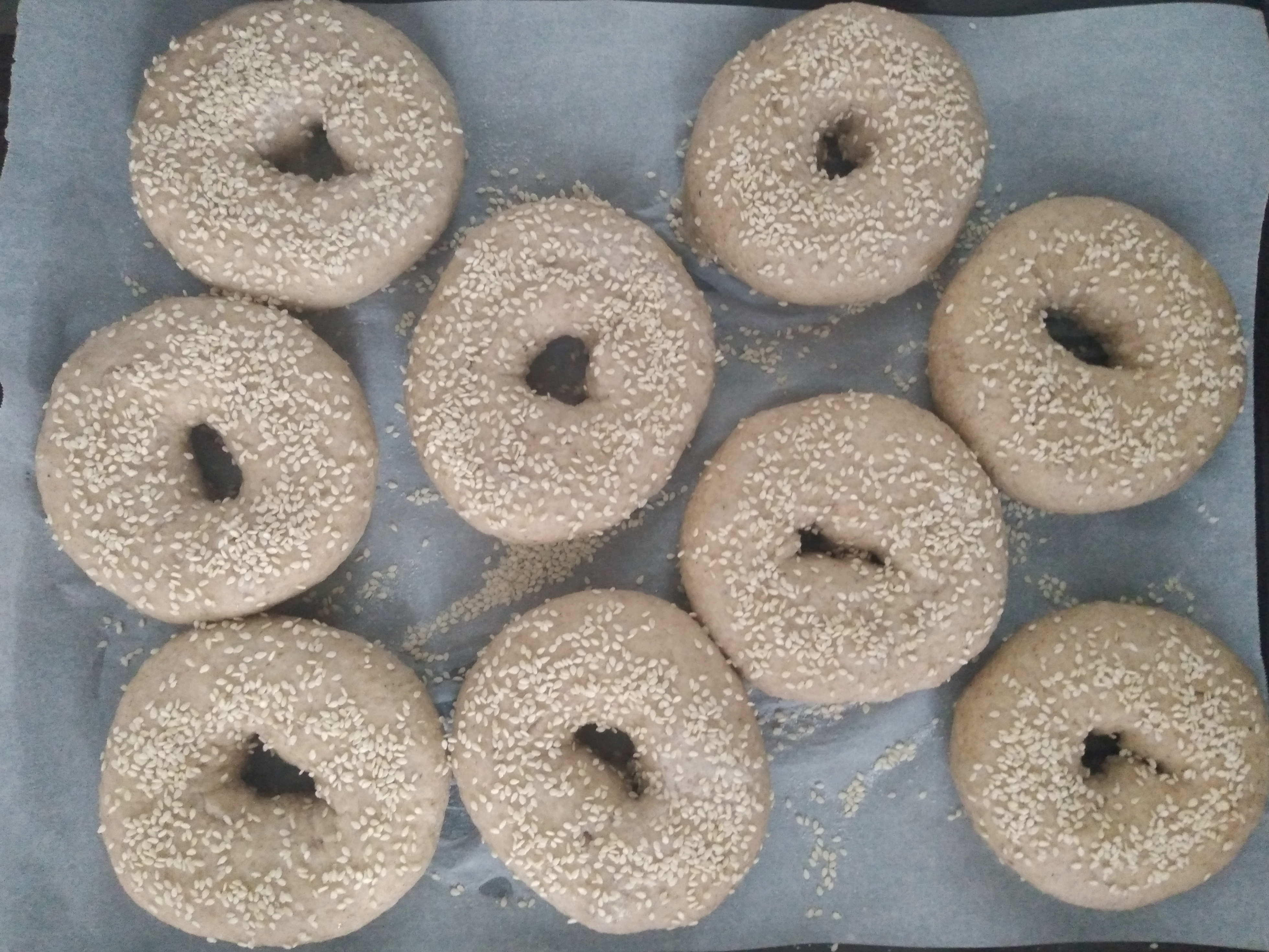 5. Once the dough has risen, pre-heat the oven to 220°C. Then, put a teaspoon of salt into a large saucepan, along with lots of boiling water, or boil the water in the pan. The amount of water will depend on the size of your pan – I think I used about 4 litres. Aim for the water to fill about two thirds of the pan. Heat the water until it reaches a vigorous boil (if you put boiling water into the pan, it will need to be heated back to a vigorous boil before you add the bagels). Then, using a slotted spoon, carefully put a couple of bagels into the water. The number of bagels per time will depend on the size of your pan, but err on the side of fewer rather than more bagels per time, so that they have sufficient space to float on the top of the water. Bear in mind the bagels will expand as they are boiled. Once the bagels have risen to the top of the water, boil them for a minute and then flip them with over with a spoon to spend a minute in the water on the other side. Then, carefully lift the bagels out of the water with a slotted spoon and place on to the lined baking tray. I found it best to put the side that was most recently in the water down on the pan. Repeat this process until all the bagels have been in the water.