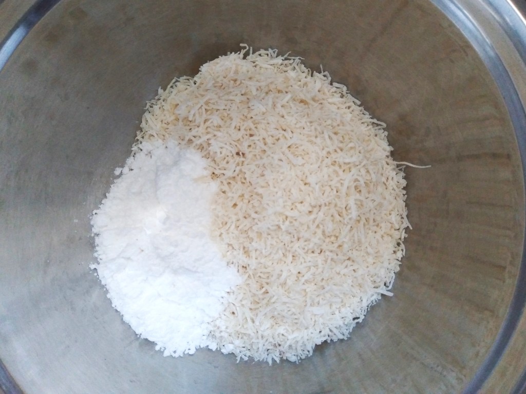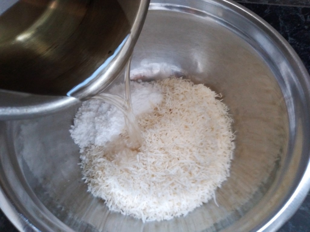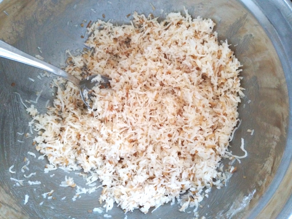 3. Place the shredded coconut and icing sugar in a large bowl and carefully add the melted coconut oil. If the oil is too hot, it may toast the shredded coconut slightly (as the photos show I ended up doing) but this won’t affect the final taste. Mix everything together until well combined.