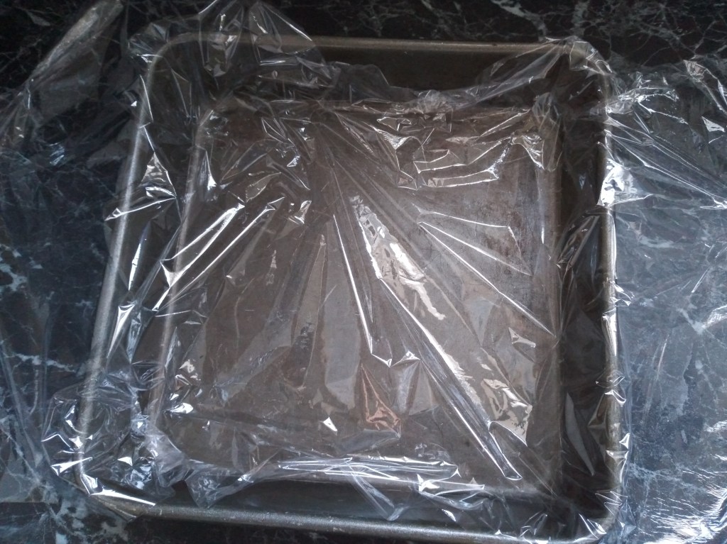1. Line a 9 x 9 inch baking pan with cling film. You can use a different size pan if you want – that will just change the thickness of the coconut layer in each bite.