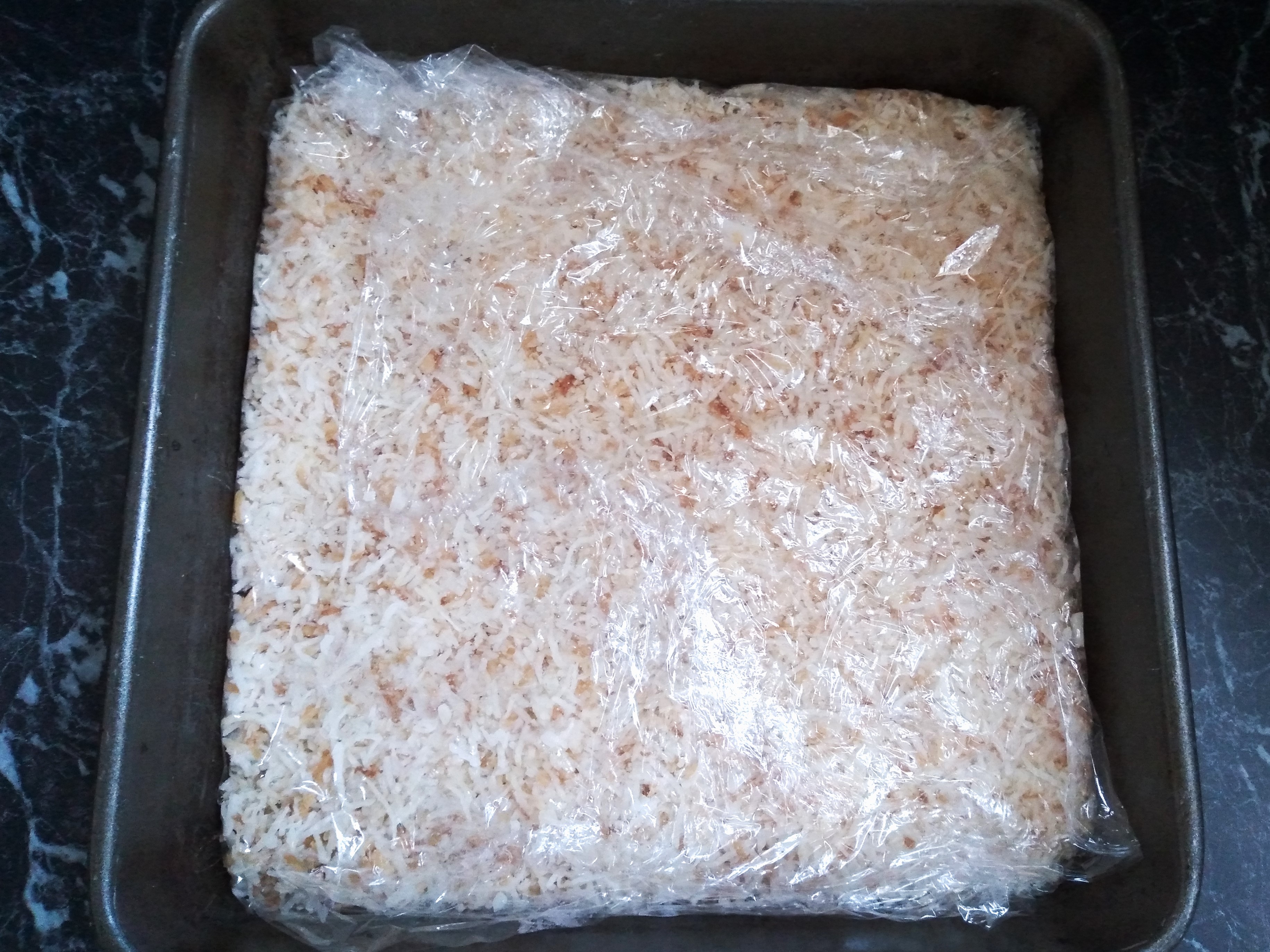 4. Spread the coconut mixture evenly across the lined baking pan and then press down well to compact the coconut slightly and to create a flattish surface across the top.