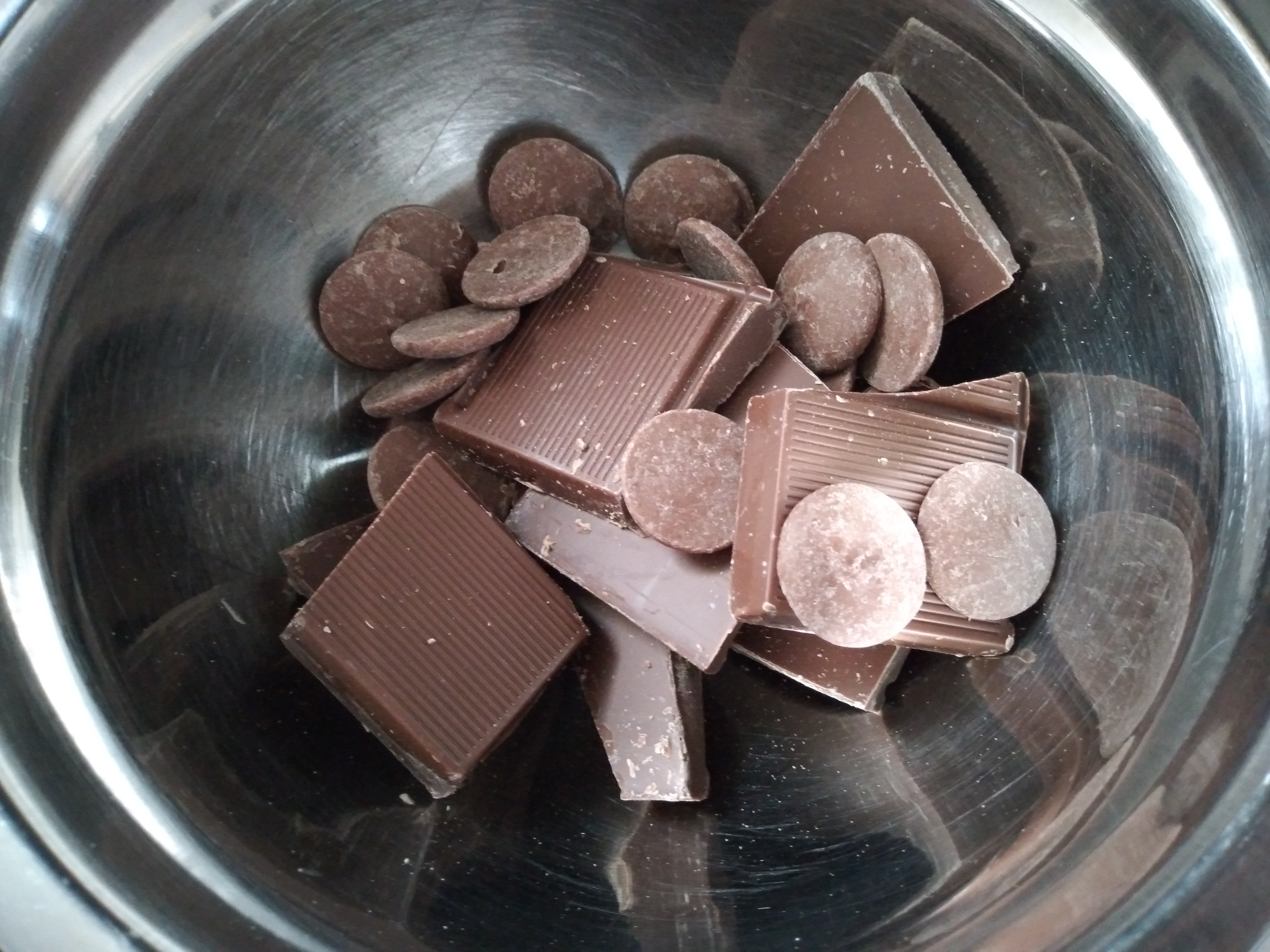 6. Just before removing the coconut mixture from the freezer, start melting the chocolate, being careful not to let any water into the chocolate. This can be done either in the microwave or in a double boiler. If in the microwave, break the chocolate into small pieces and place in a microwavable bowl. Microwave the chocolate on high in 15 to 20 second bursts at a time, mixing the chocolate between times with a fork, until it is fully melted. If in a double boiler, fill the bottom of the boiler with boiling water, break the chocolate into small pieces and place it in the top of the double boiler, and then put the top of the double boiler over the bottom. Place the whole thing on the stove over a medium heat and stir the chocolate occasionally until it has fully melted, at which point turn off the heat. If you melt the chocolate in a double boiler, it may be helpful to wrap the bottom of the bowl the chocolate is in in a clean tea towel, as this will help prevent drips of water falling on to the coconut bites during the next few steps below.