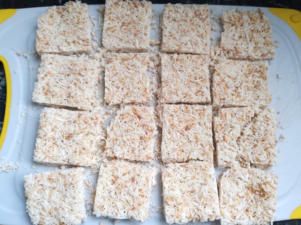 6. As the chocolate is melting, remove the coconut mixture from freezer and cut into pieces with a warm knife. To warm the knife, run it under hot water for a minute or two and then dry it before using. For more neat pieces, you should rewarm the knife regularly as you are cutting up the coconut – I tend to get lazy and aim for a more ‘rustic’ look! I initially cut mine into 16 pieces but will cut it into 32 next time – just cut pieces of whatever size you prefer!