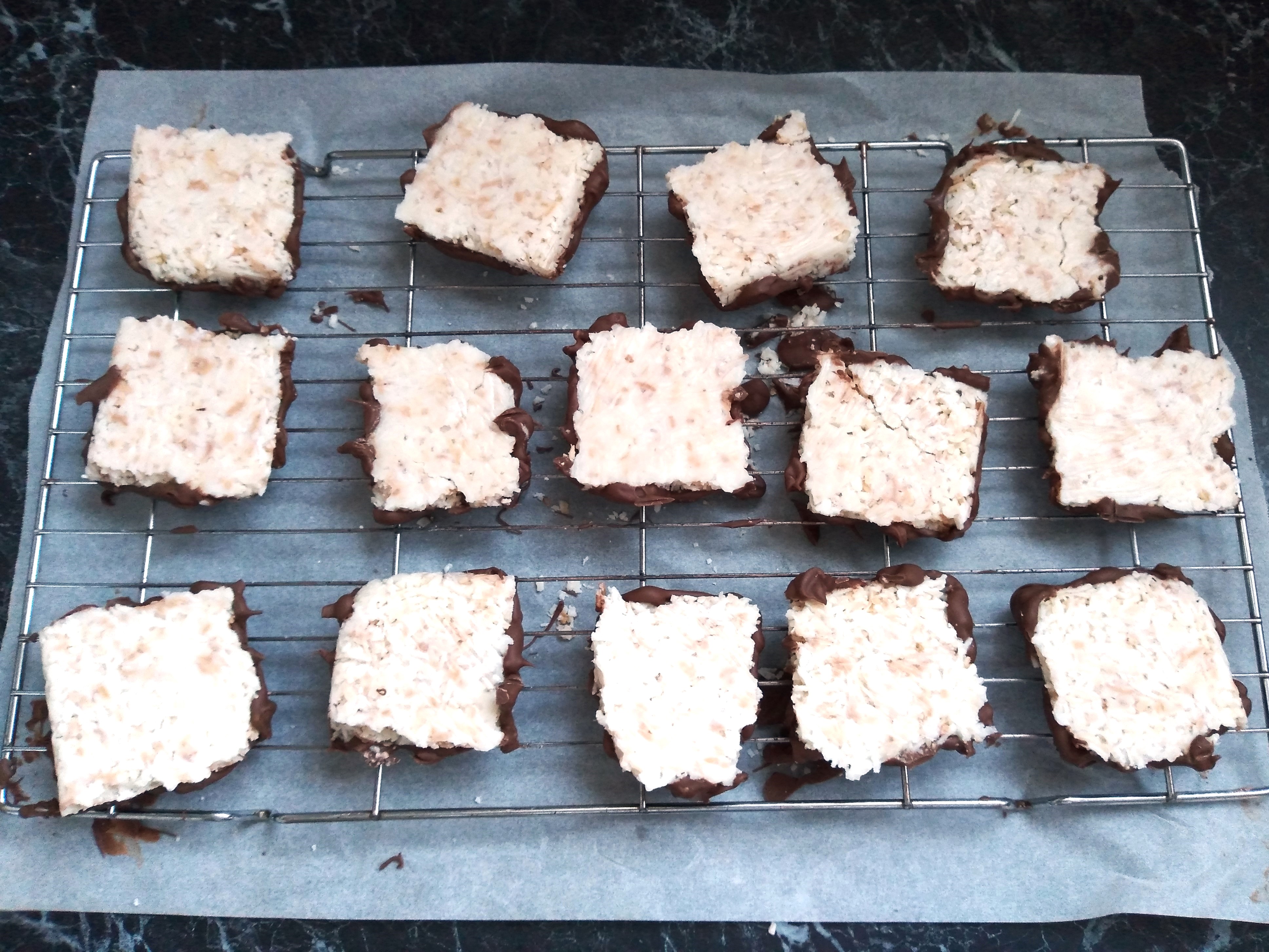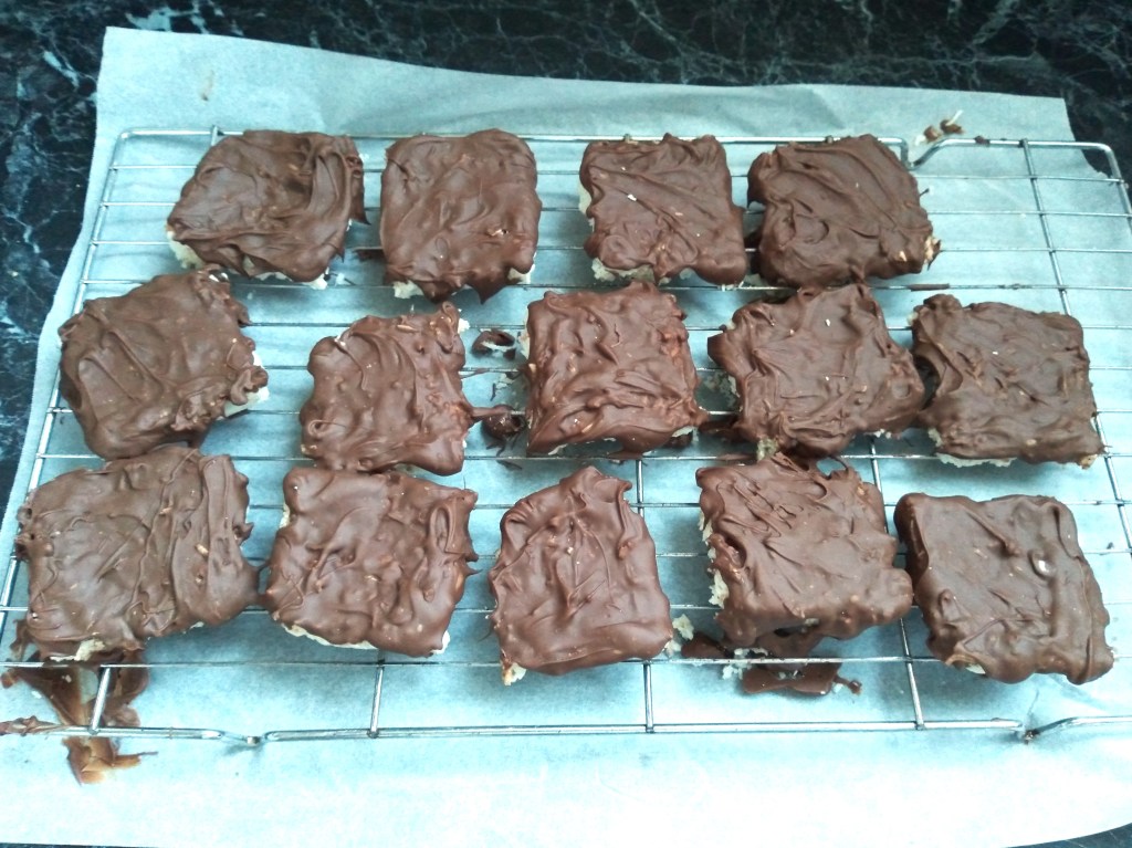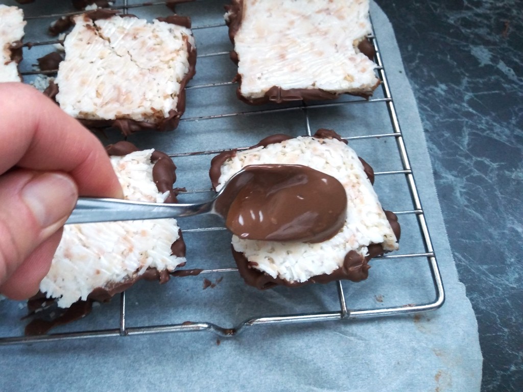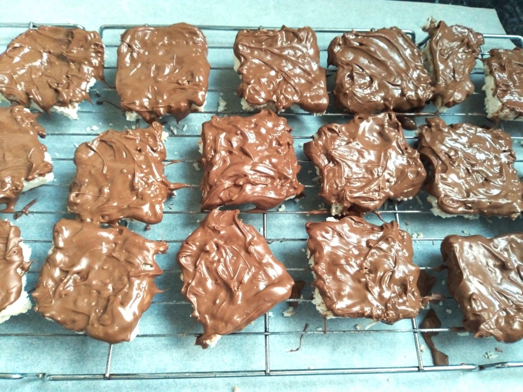 7. Spread the coconut pieces on a cooling rack with a piece of baking paper or something similar to catch chocolate drips below the cooling rack. Spread chocolate on top of each coconut piece and off the edges so that it drips down the sides. I found it easiest to do this with the back of a spoon. Once you have spread chocolate over the top of every piece, place the whole thing in the fridge for at least half an hour to set the chocolate.