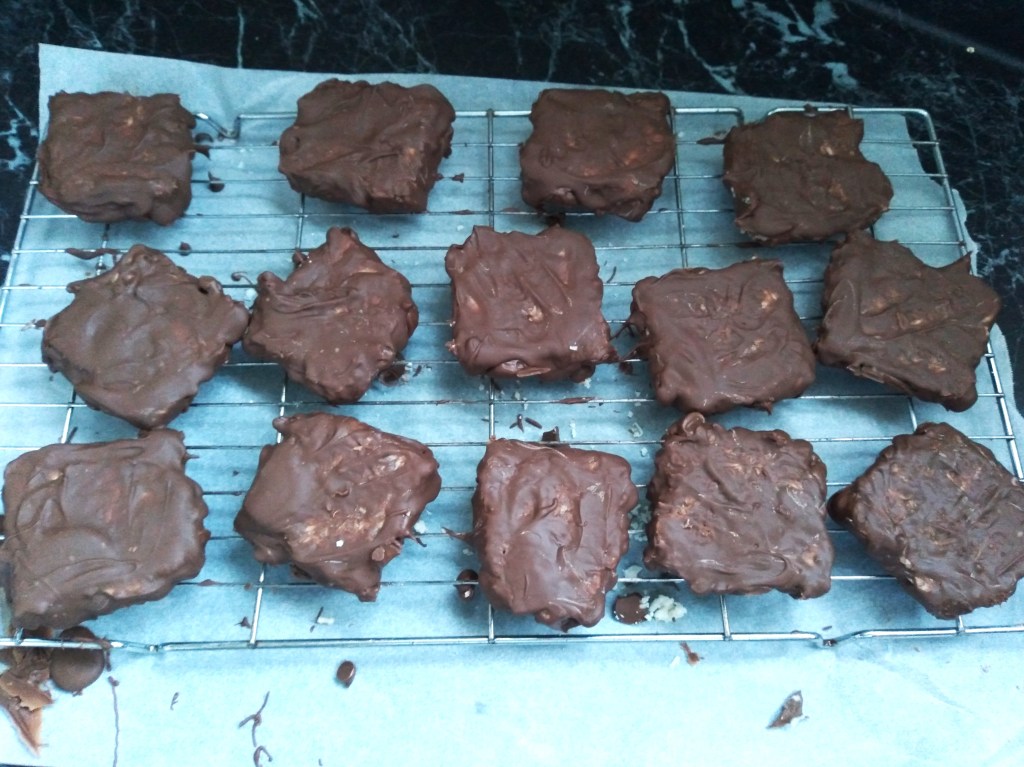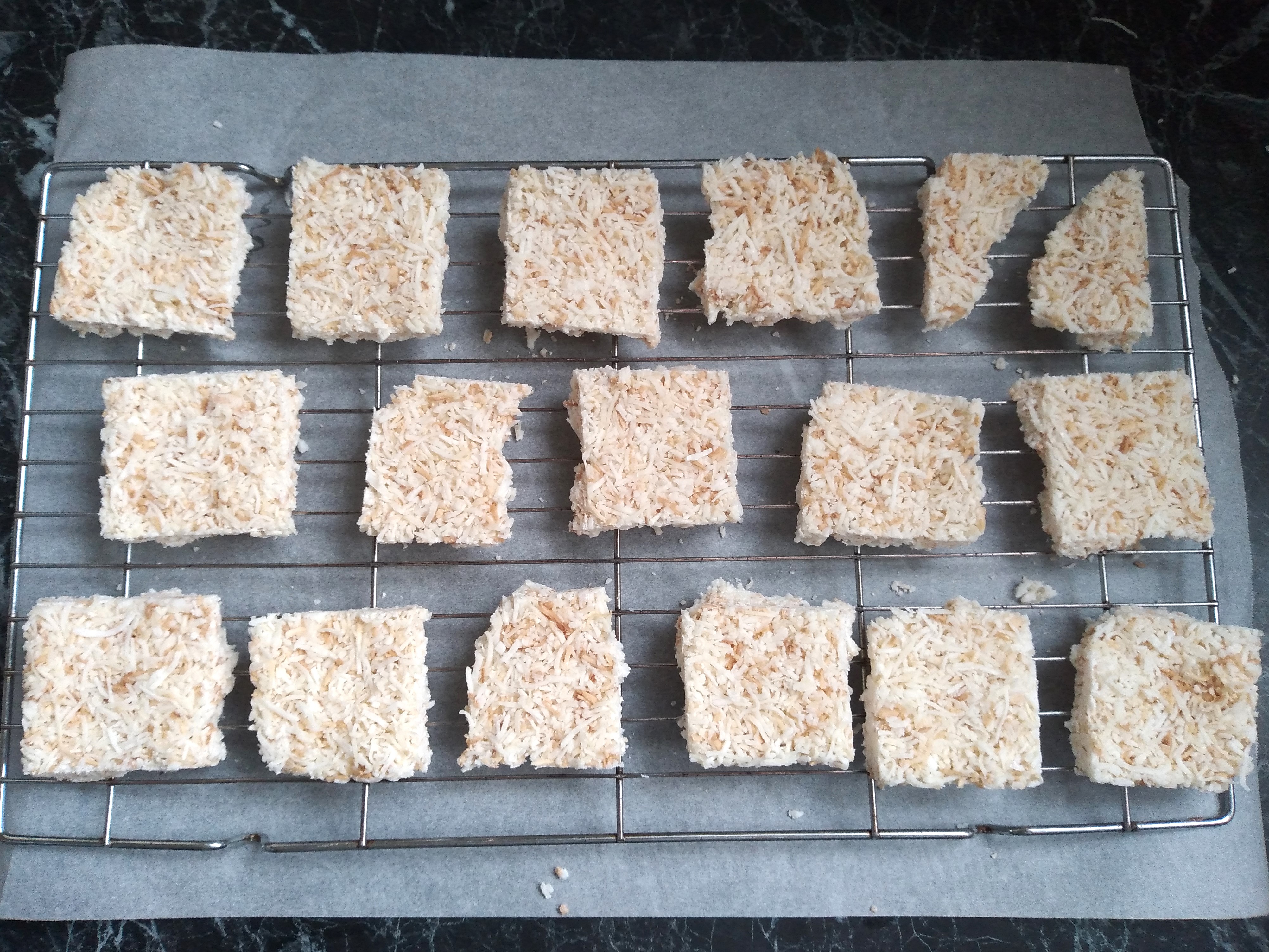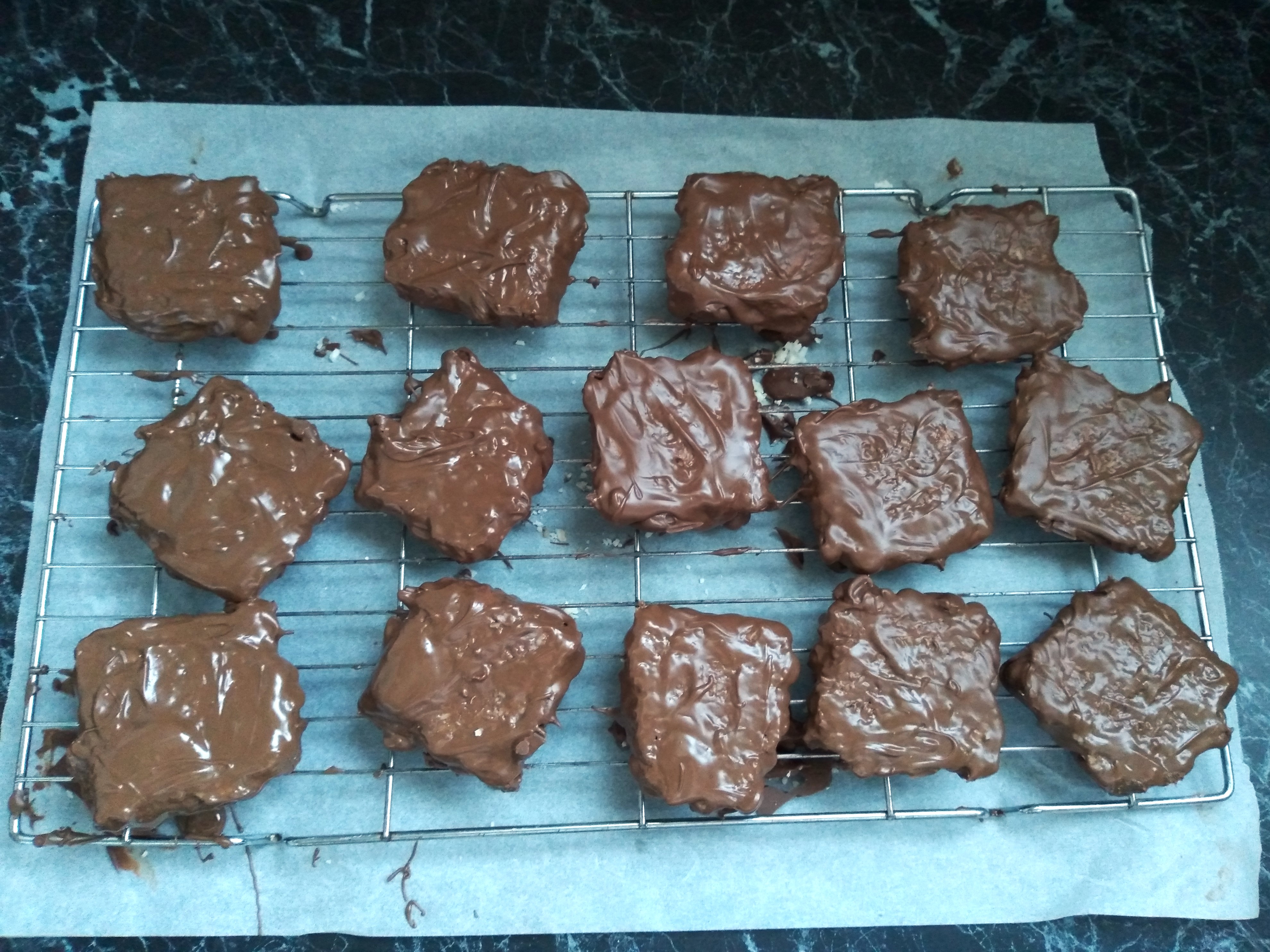 7. Spread the coconut pieces on a cooling rack with a piece of baking paper or something similar to catch chocolate drips below the cooling rack. Spread chocolate on top of each coconut piece and off the edges so that it drips down the sides. I found it easiest to do this with the back of a spoon. Once you have spread chocolate over the top of every piece, place the whole thing in the fridge for at least half an hour to set the chocolate.
