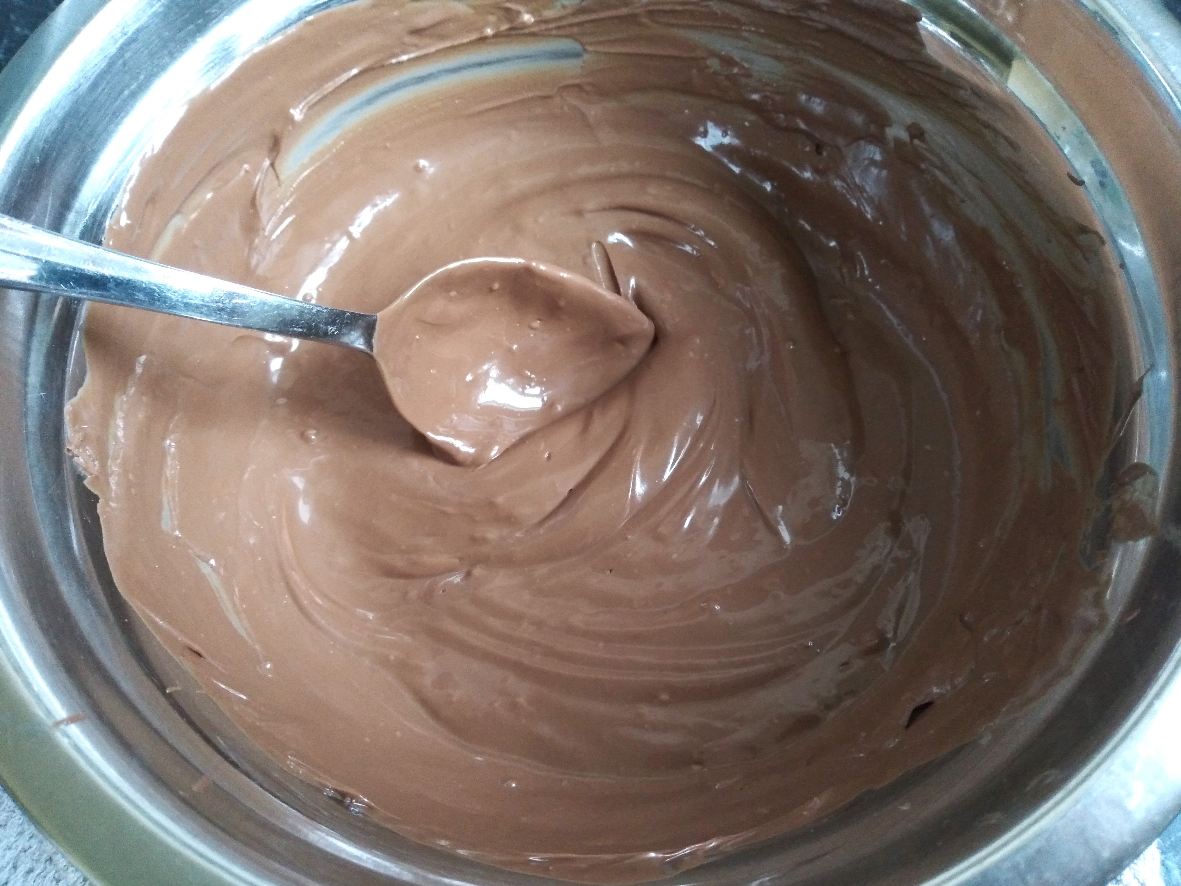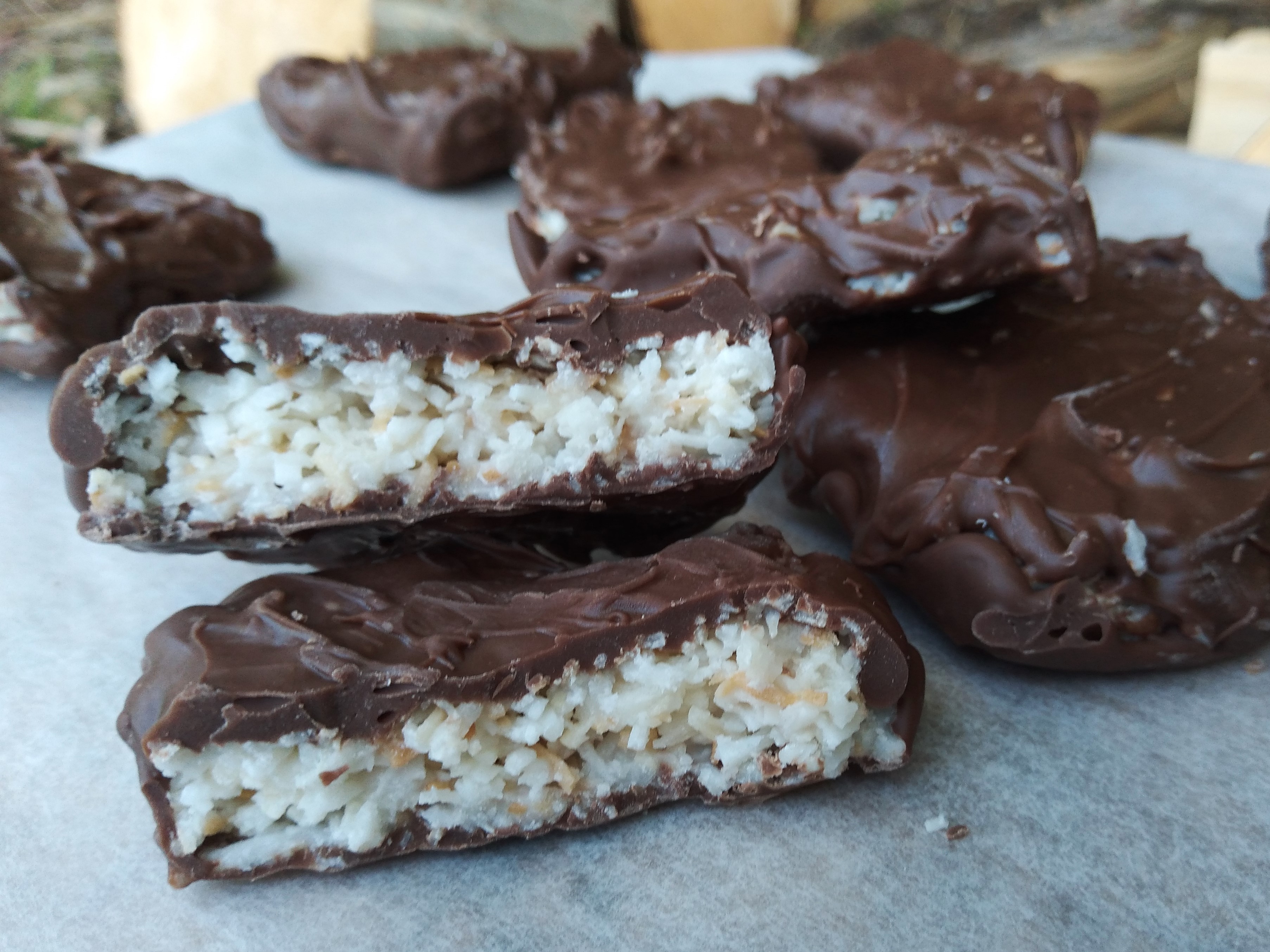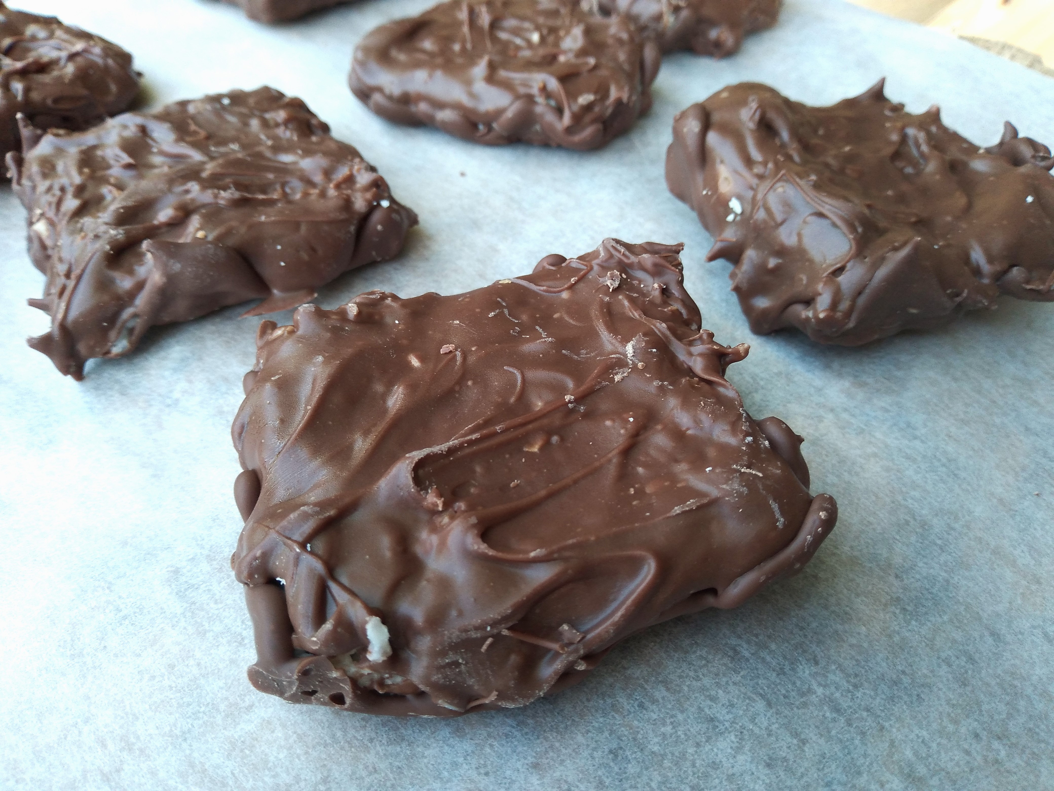 9. Spread chocolate over the top of each flipped-up piece of chocolate coconut, pushing it off the edges and down the sides where there are sides that are not completely covered in chocolate.