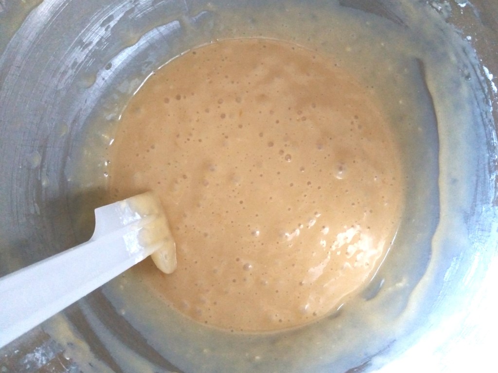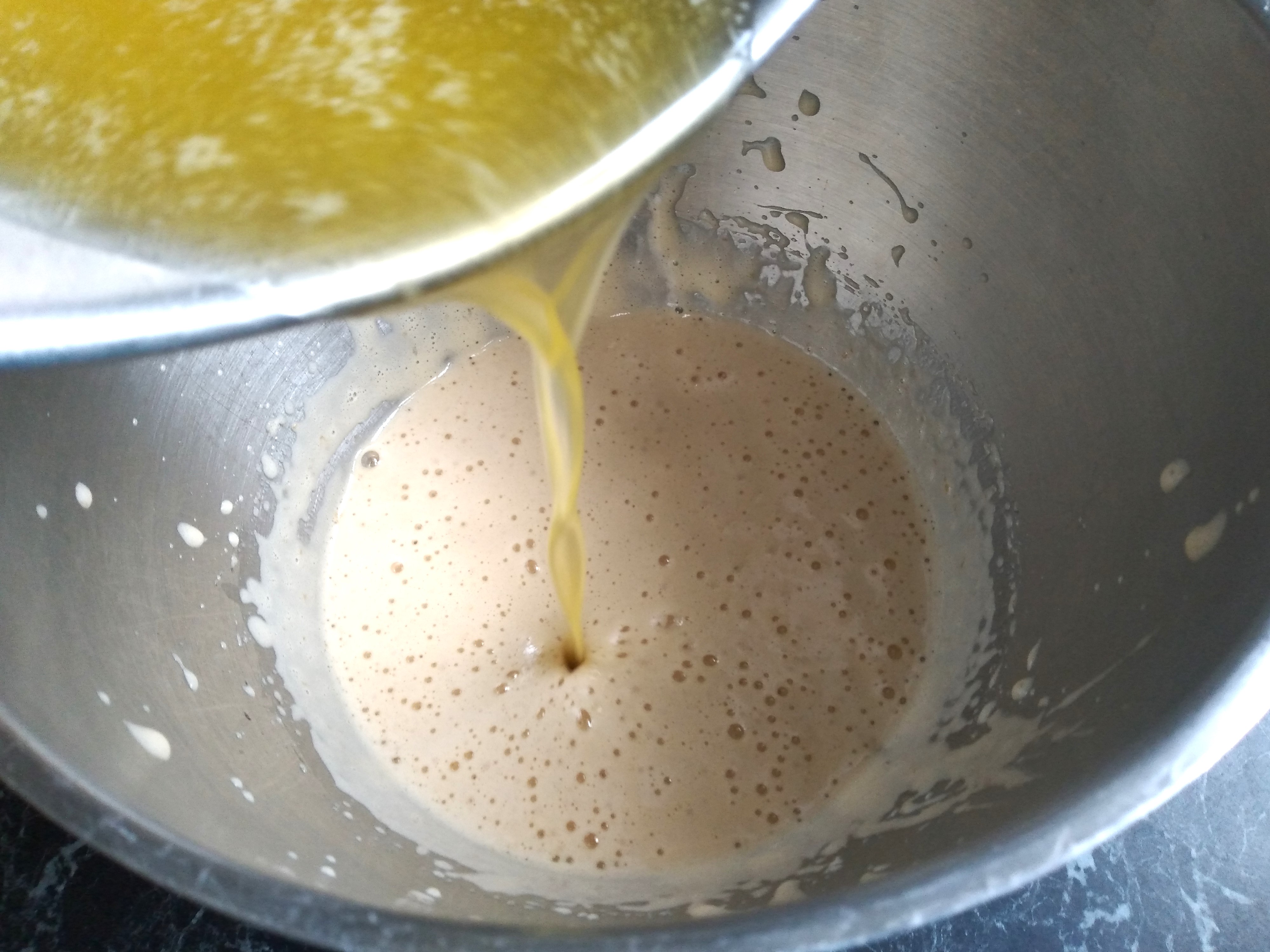3. Add the melted butter and oil to the egg/sugar mixture and fold together carefully, being careful not to lose any air.