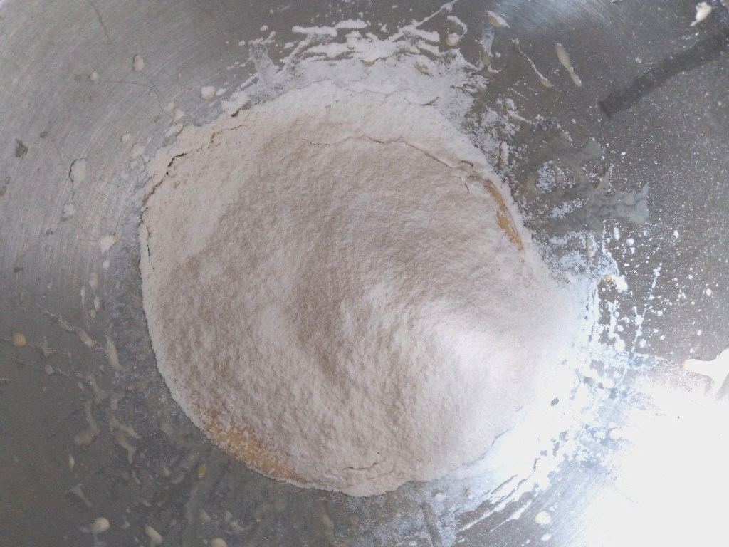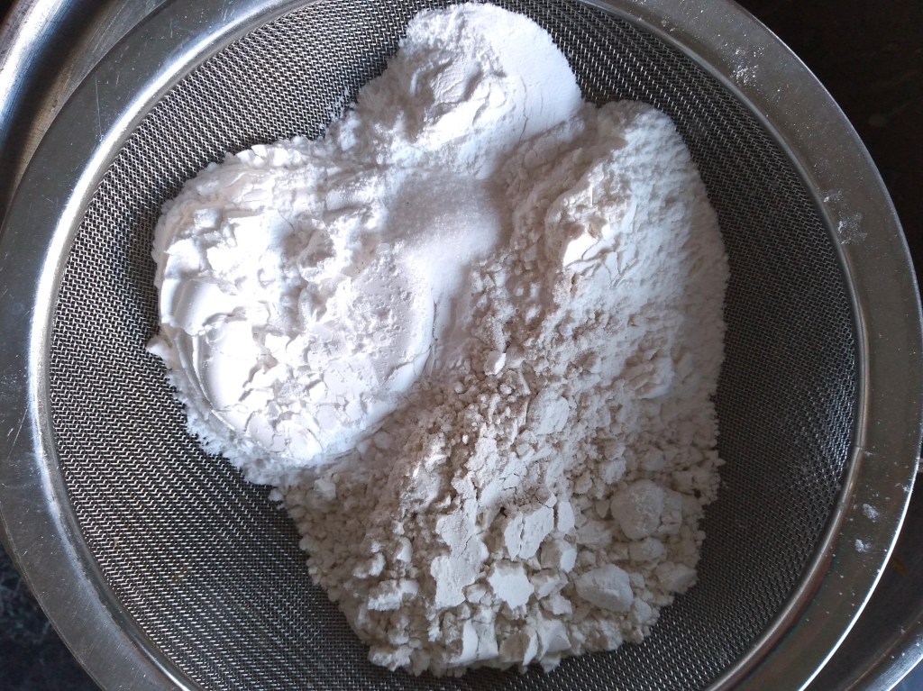 5. Sieve together into the bowl the rice flours, tapioca starch, salt and baking powder and again carefully fold in, being careful not to lose any air.