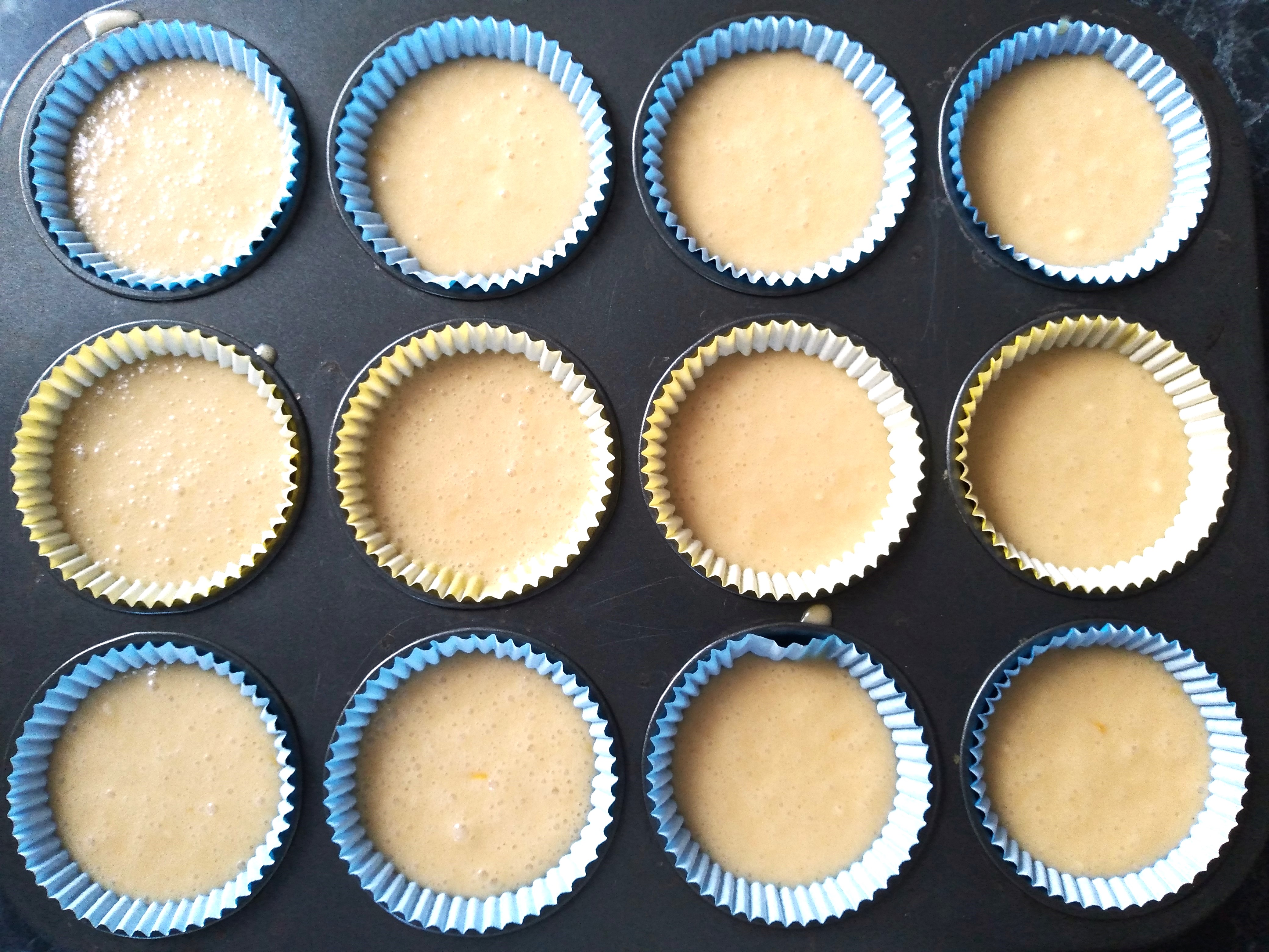 6. Fill each cupcake case to about 1 cm below the top of each case. As mentioned above, if you have any leftover batter don’t leave it sitting on the side, but rather tip it into a small, greased ovenproof container to bake alongside the cupcakes.
