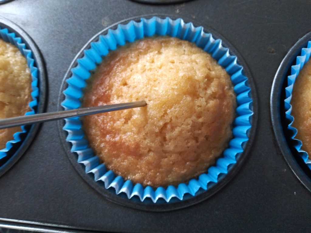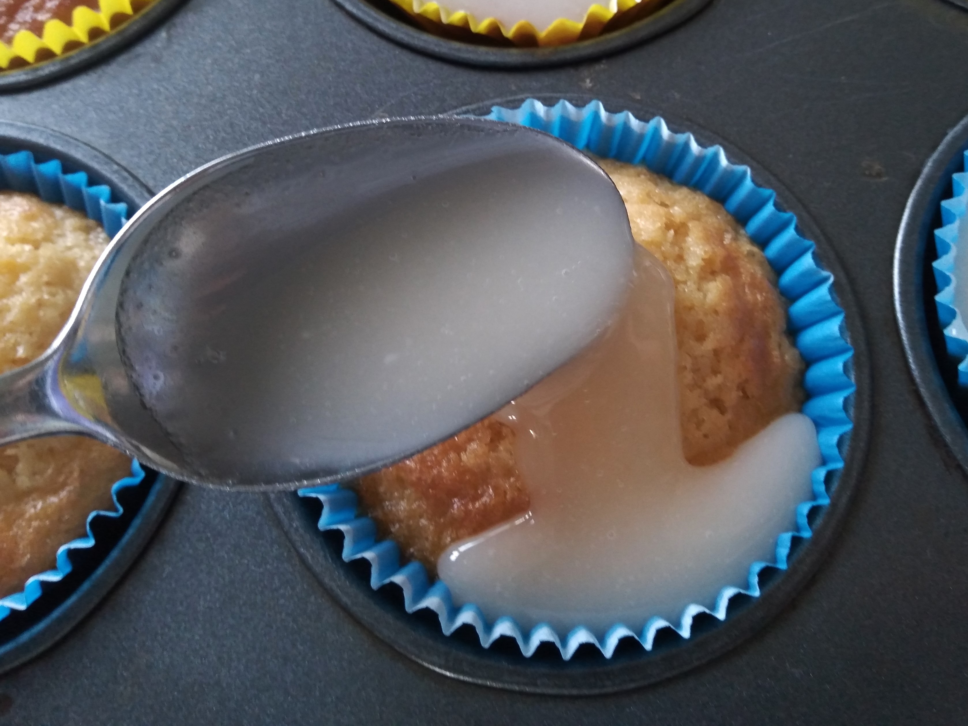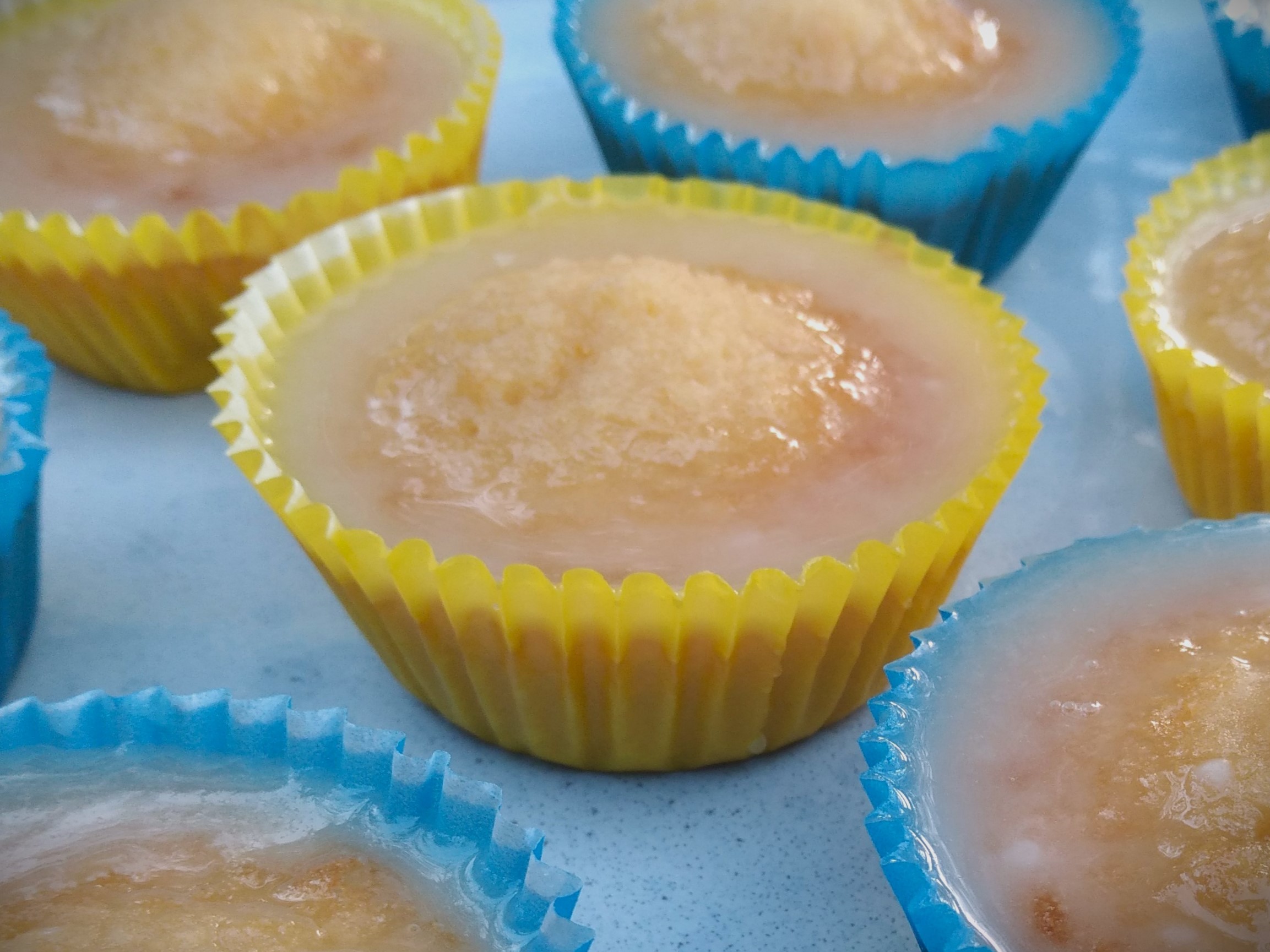 9. Once the cupcakes have cooled, poke a few holes into the top of each one with a skewer and then spoon 1 – 2 dessertspoons of icing over the top of each one. Allow the cupcakes to cool completely and the icing to harden slightly before eating. I usually leave them in the cupcake pan on a cooling rack for this, but once the icing has hardened slightly and won’t run over the sides of the cupcake cases, you could leave them to cool on a cooling rack out of the cupcake pan.