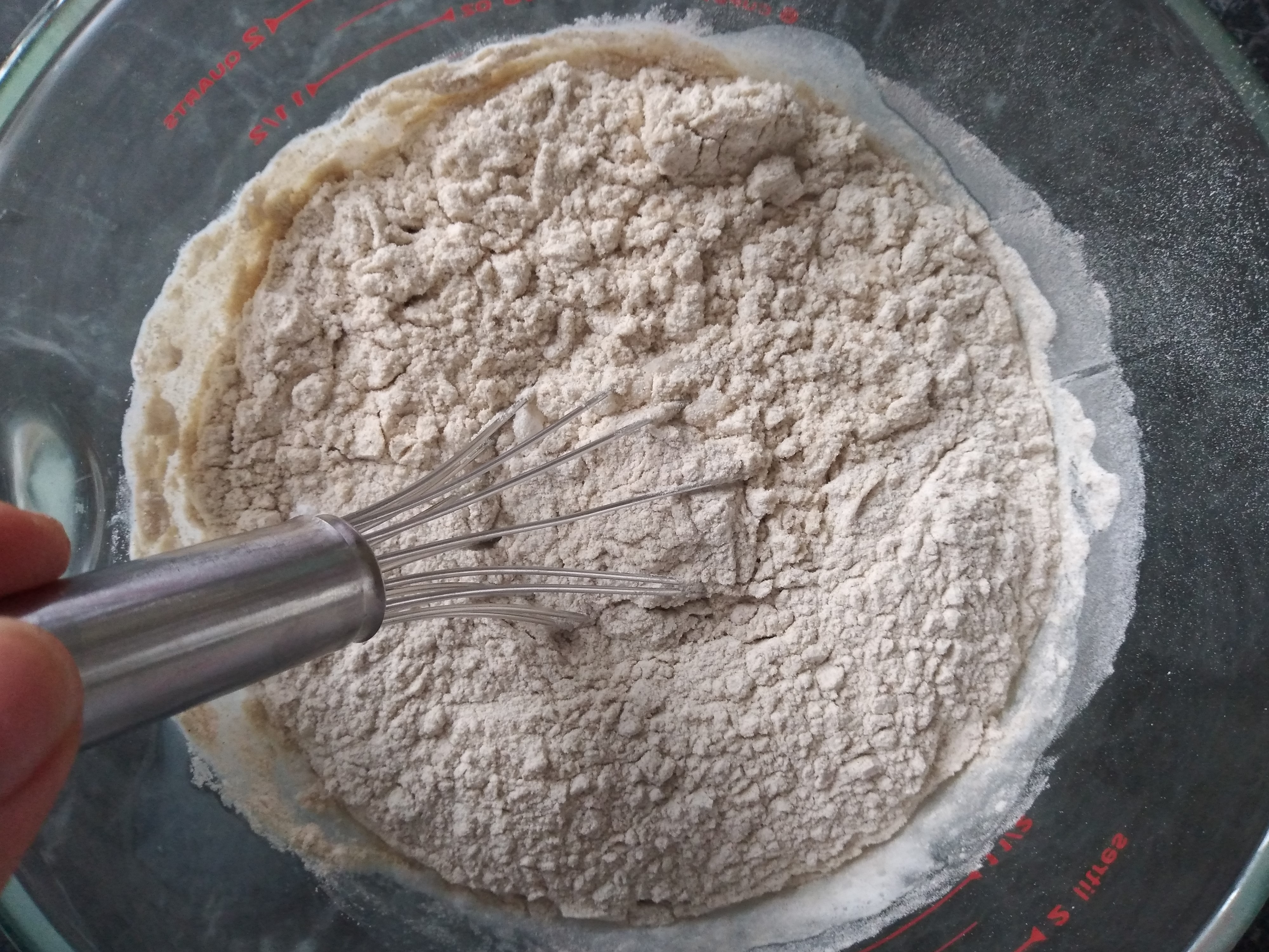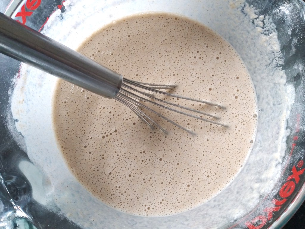 2. Place the eggs, flours, baking powder, salt and milk (and water, if using) in a large bowl and whisk together until well combined. Ideally you should sift the dry ingredients into the bowl, but I usually forget to do that!