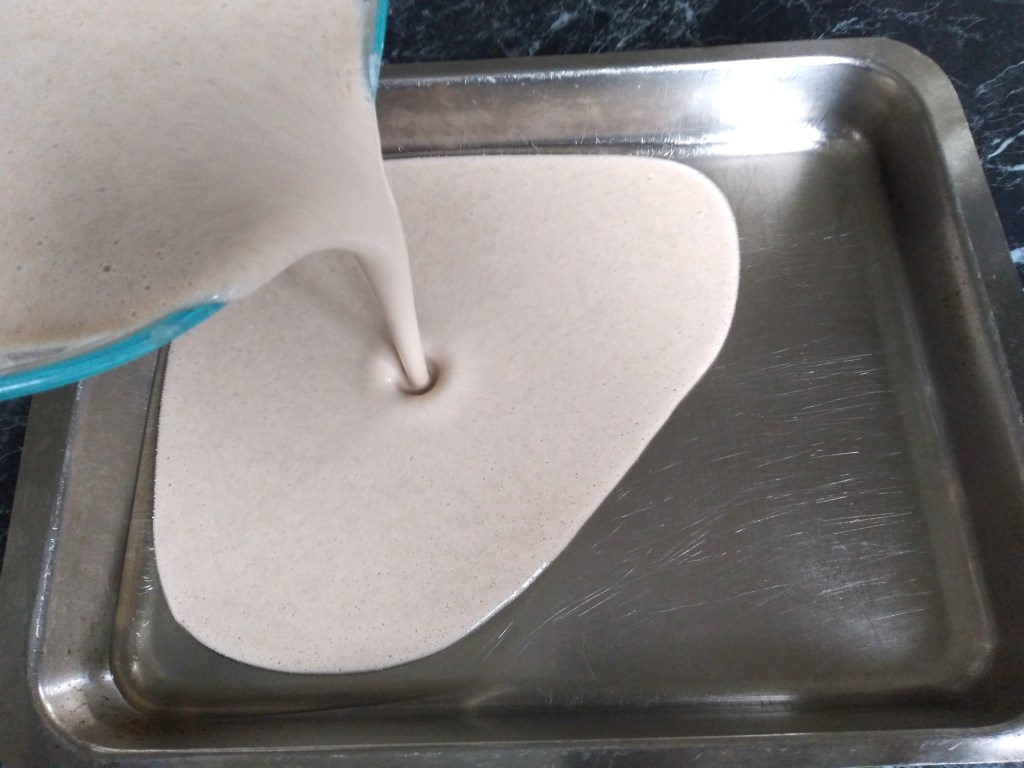 3. Once the batter is ready, remove the baking pans from the oven and carefully spread the hot oil across the pans by tilting them until the bottom is completely covered in a layer of oil. It doesn’t matter if there are little pools of oil in parts of the pans once this is done.