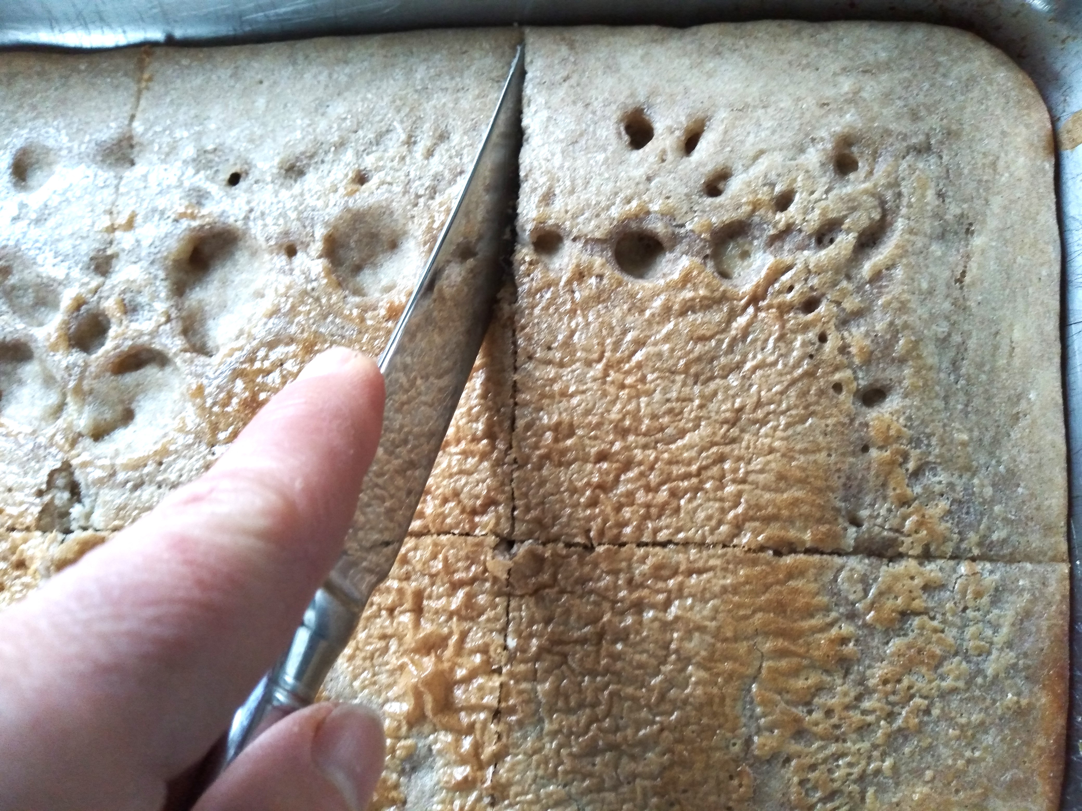 5. Once baked, remove from the oven and leave to cool for a few minutes before marking out slices and removing each slice from the pan with a turner/spatula.