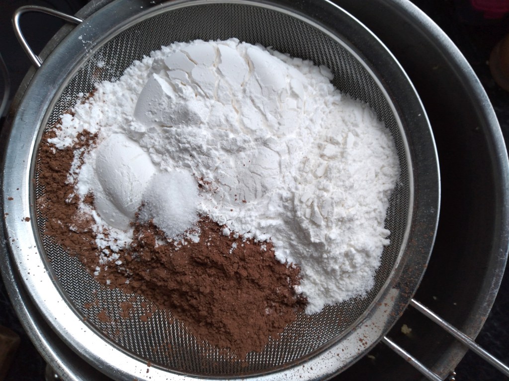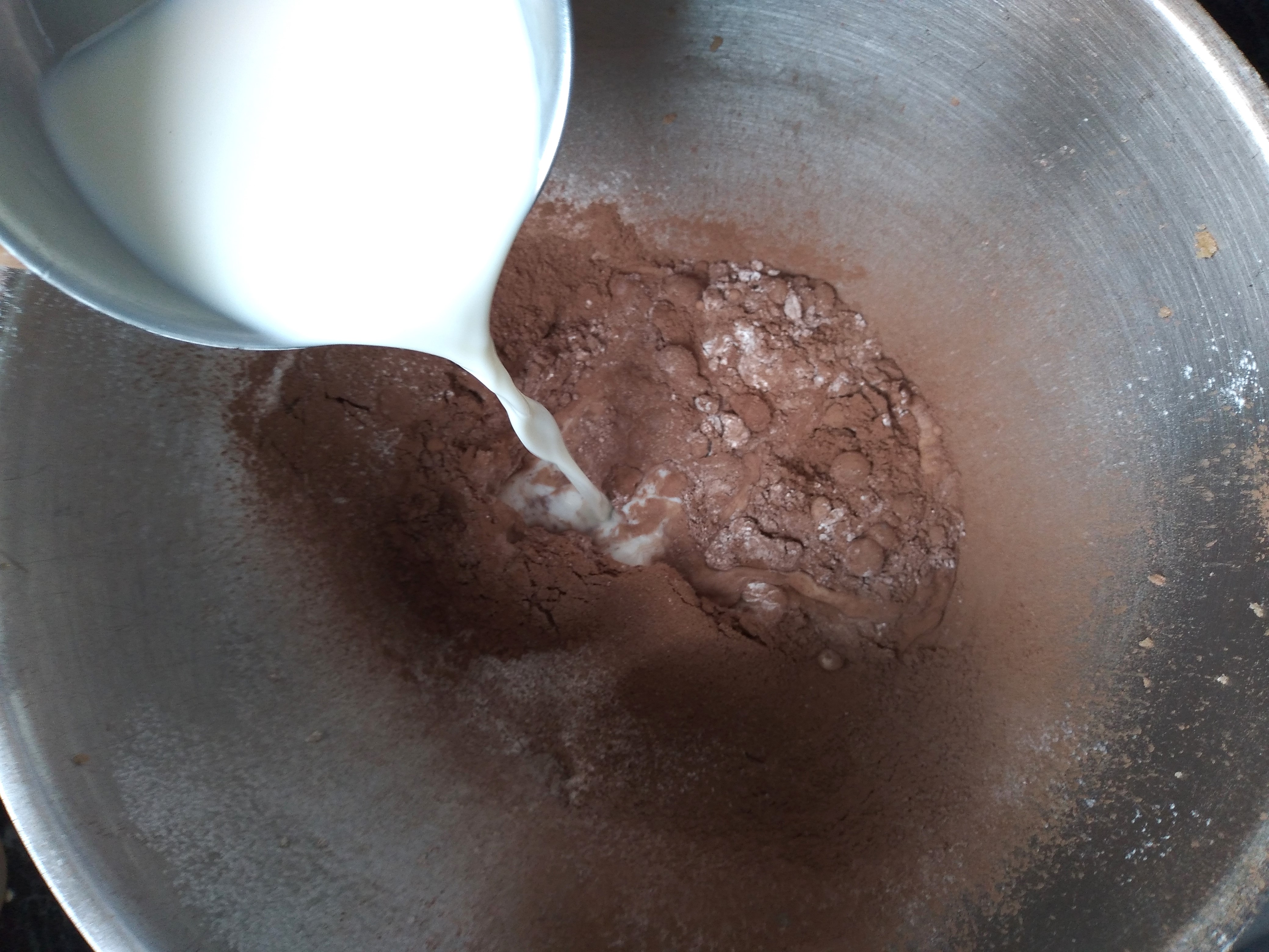 3. Sift the cocoa powder (listed in the cake part of the ingredients list), white rice flour, tapioca starch, baking powder and salt into the bowl. Then, add the milk and vanilla essence to the bowl and mix everything together thoroughly.
