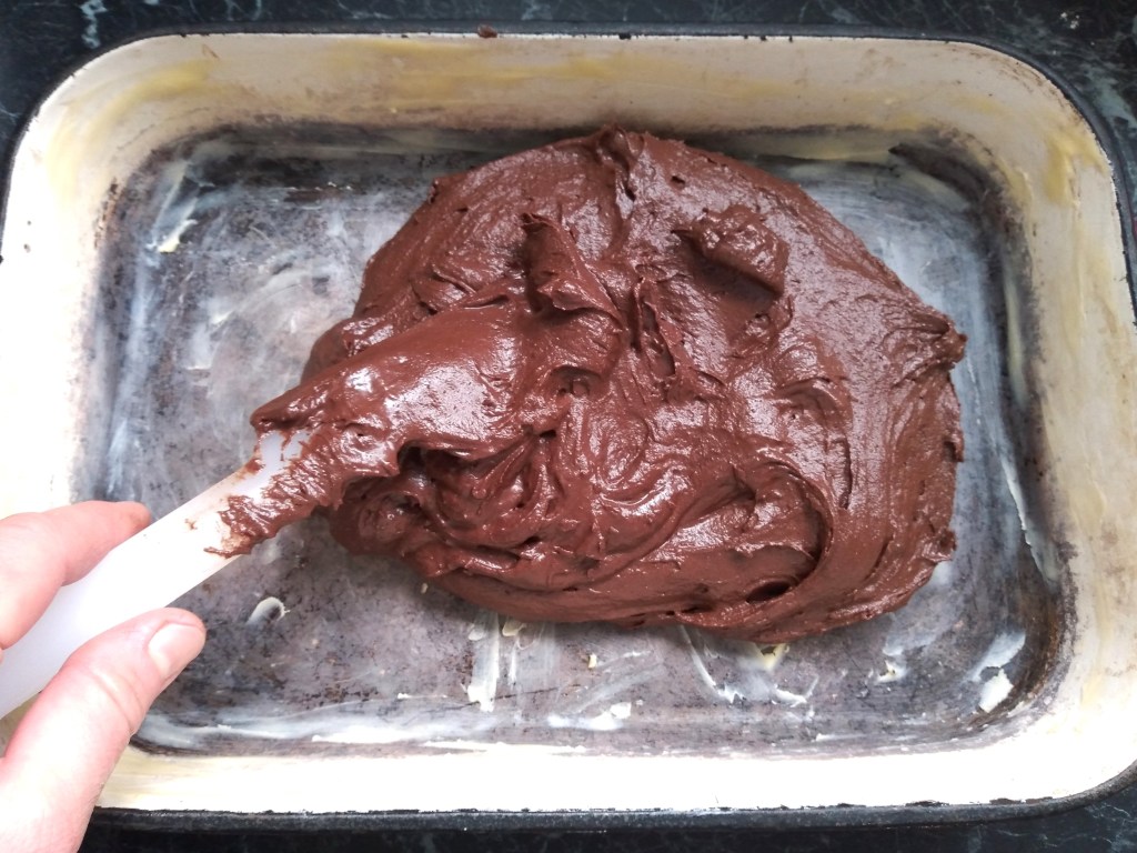 4. Tip the batter into the greased baking pan and spread across the pan evenly. If your kitchen is cold, particularly if you used butter, the batter may be quite stiff – this is normal.