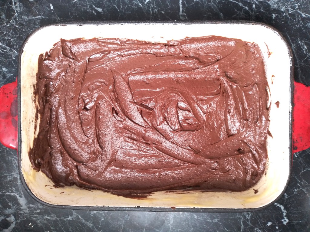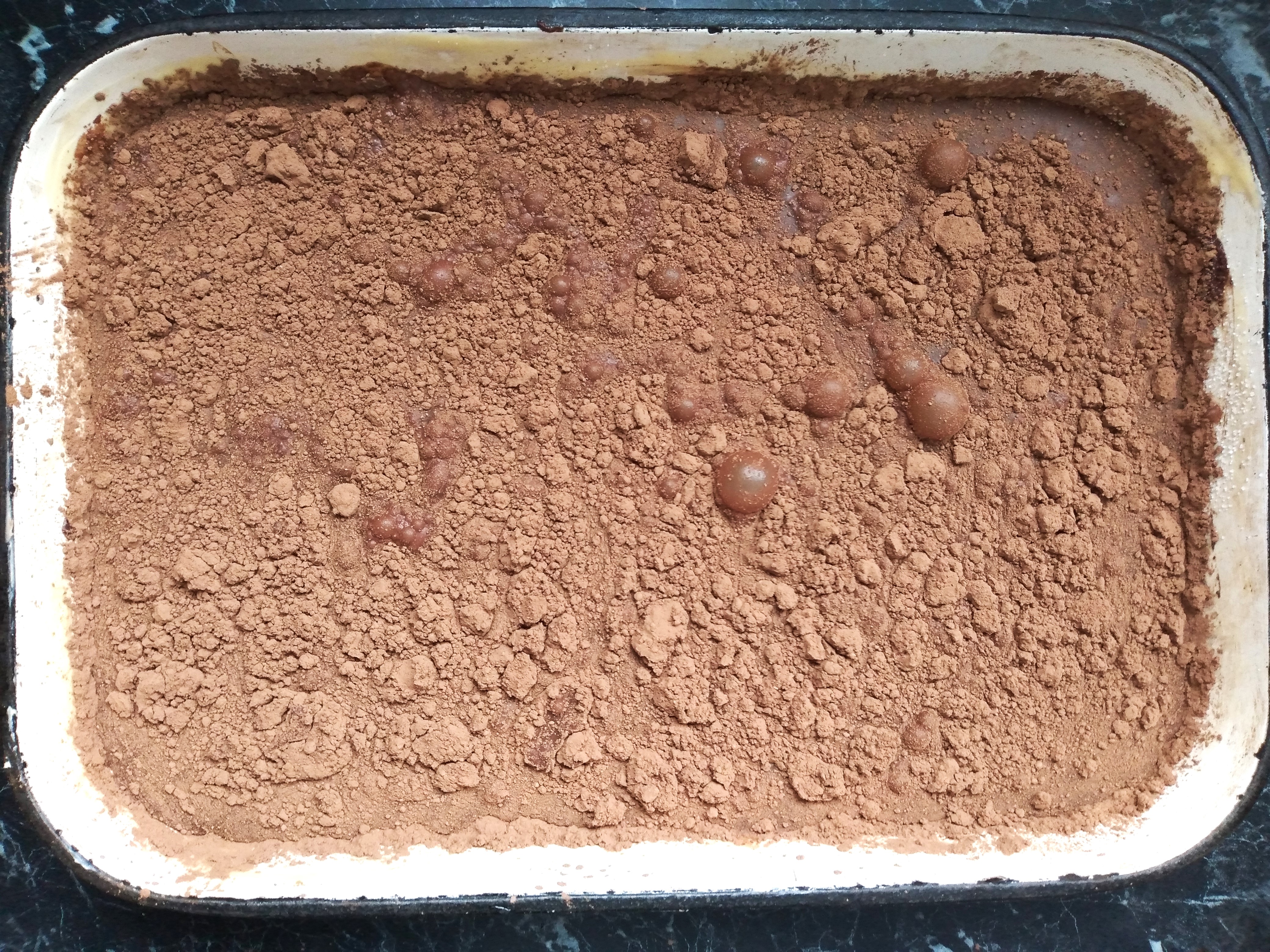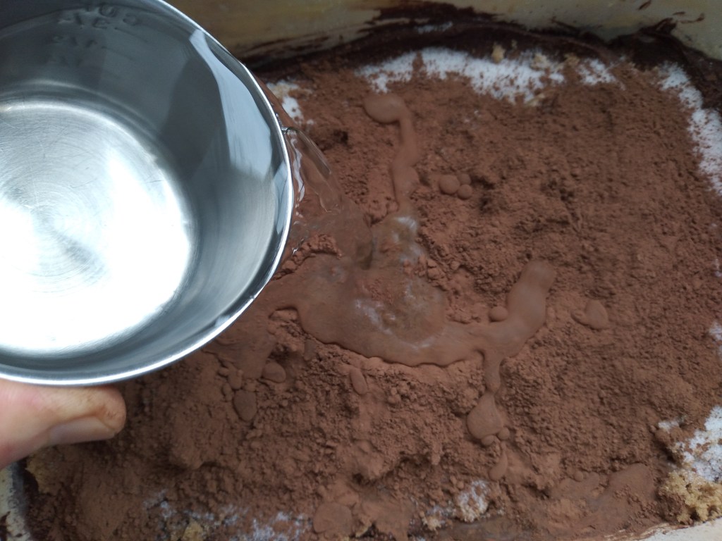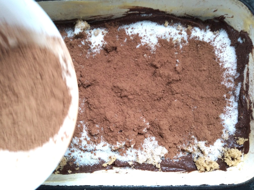 5. Sprinkle the brown sugar, white sugar and cocoa powder listed in the sauce part of the ingredients list evenly over the top of the batter, one at a time. Carefully pour the water evenly across the pan, on top of the sugars and cocoa powder – the best way to do this is to pour it slowly on to a dessertspoon first (front or back of the spoon) and then let it run off the spoon over the batter, moving the spoon around as you do so to ensure that the water is evenly distributed on top of the mixture in the pan. But, if you go carefully, you may get away with pouring the water straight over the batter (can you tell I was in a hurry when I took the photos for this blog post!).