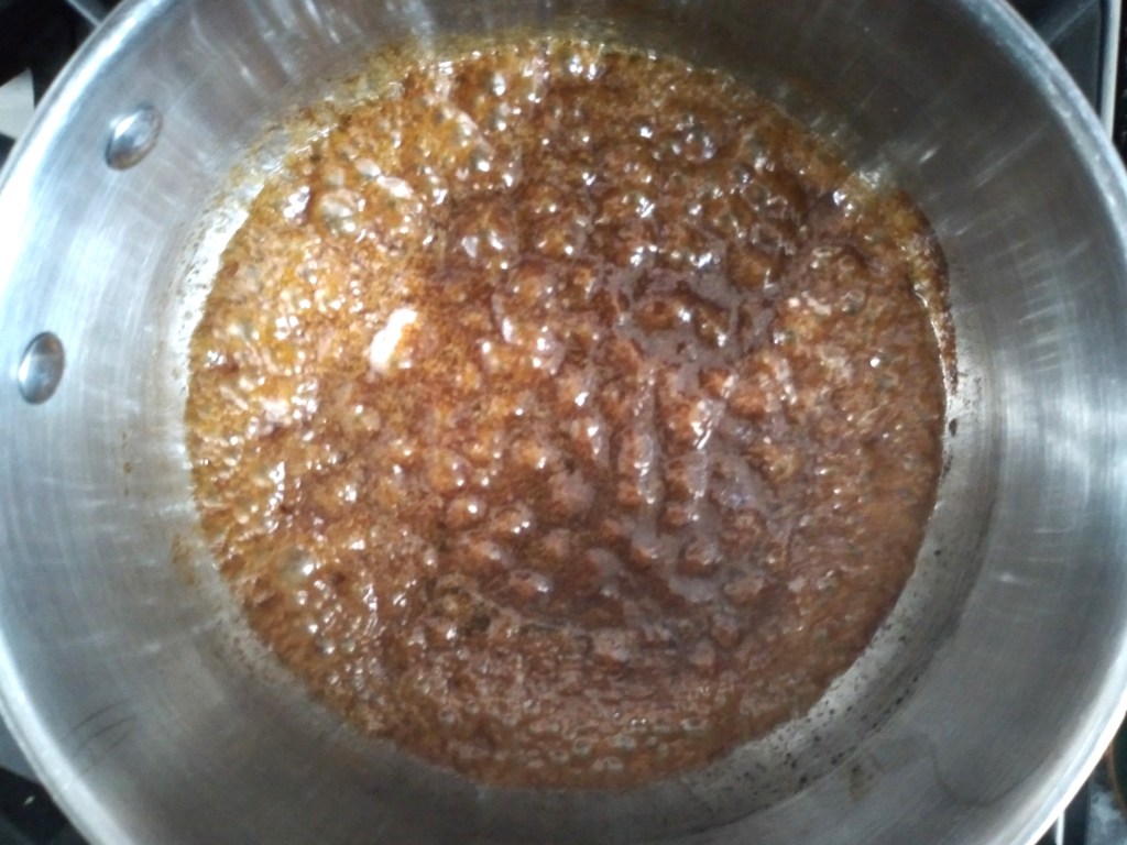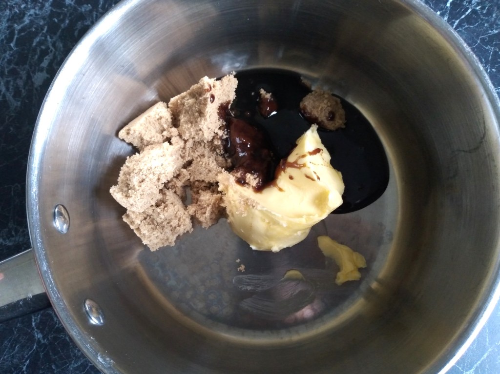 2. Place the butter, sugar and treacle together in a medium-sized saucepan over a lowish heat to melt together. Feel free to whisk the ingredients together with a whisk as the butter starts to melt, to ensure that the sugar is dissolving evenly into the butter. Once the sugar has started dissolving, place a lid on the pan and leave over a low to medium heat until everything has melted together and the mixture is bubbling all over (it is fine to peak under the lid to check on it, but make sure the mixture is bubbling everywhere and not just along the sides of the saucepan).