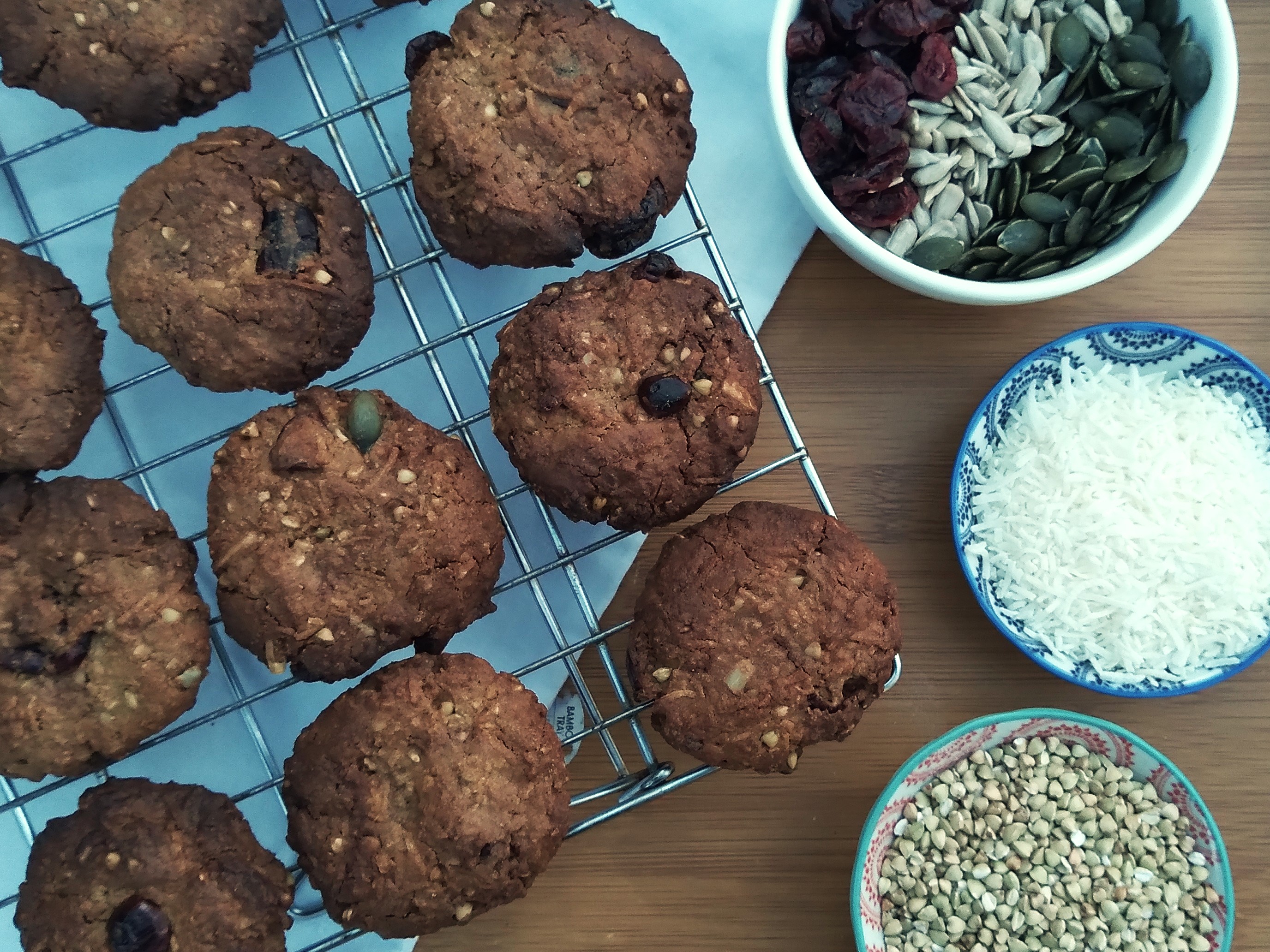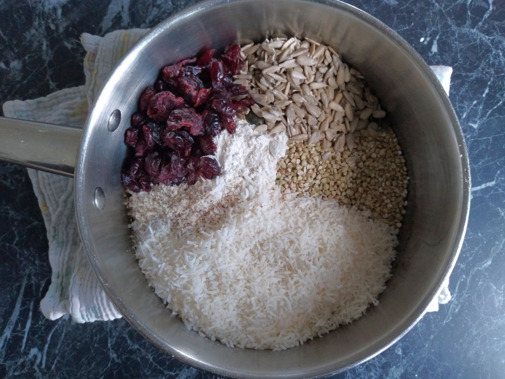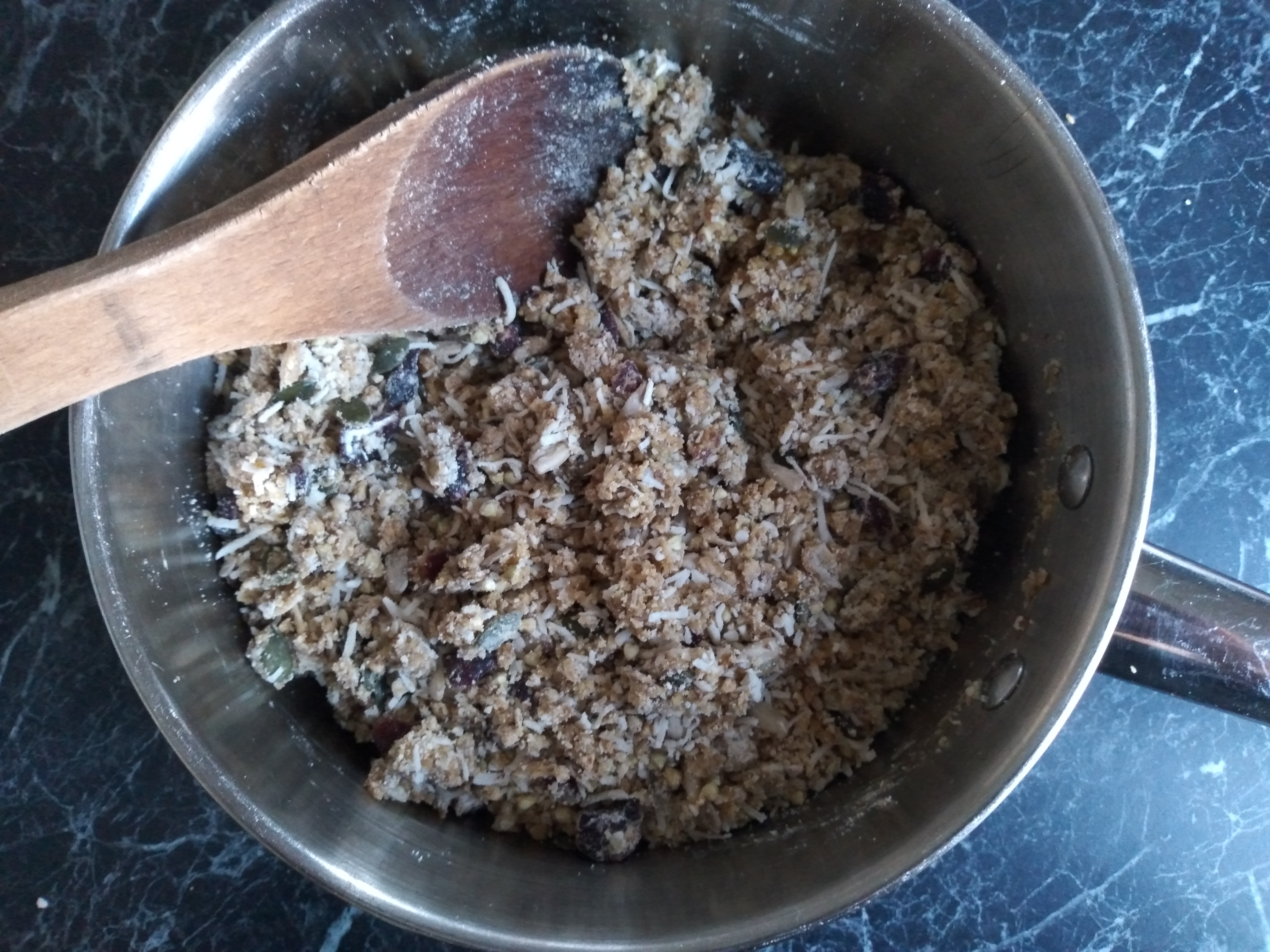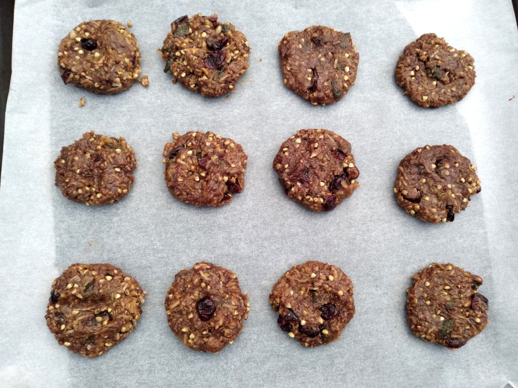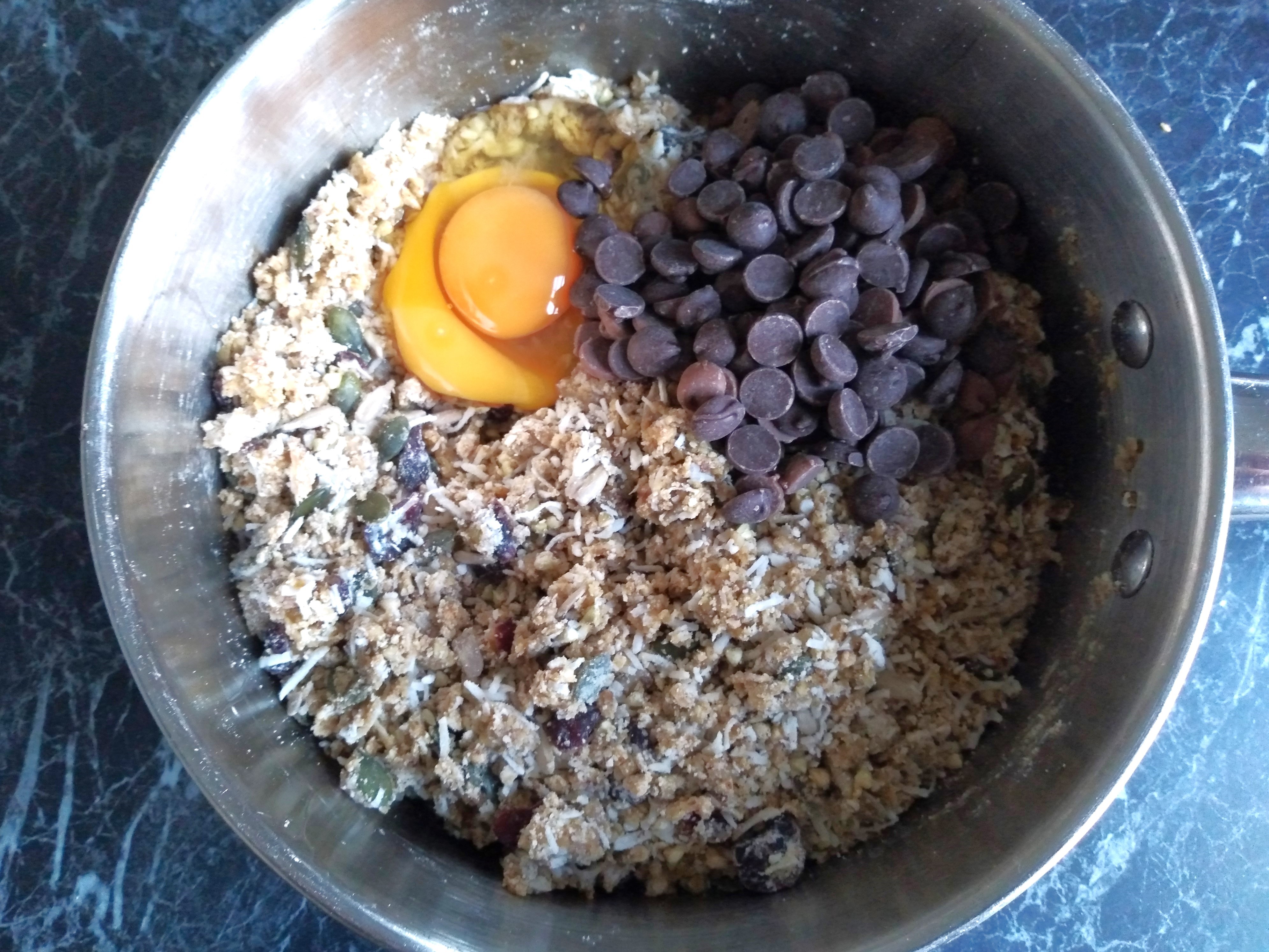 4. Add the brown rice flour, almond meal, buckwheat groats, shredded coconut, seeds, cranberries and baking powder to the pan and mix together into the melted butter/sugar/treacle mixture. If the mixture is still very hot after this, set it aside to cool further, to avoid melting the chocolate chips too much when they are added (it isn’t a problem if they do melt as the recipe should still work, but you will end up with chocolate flavour throughout the biscuit and not chocolate chip surprises as you eat the biscuit, which I far prefer!).