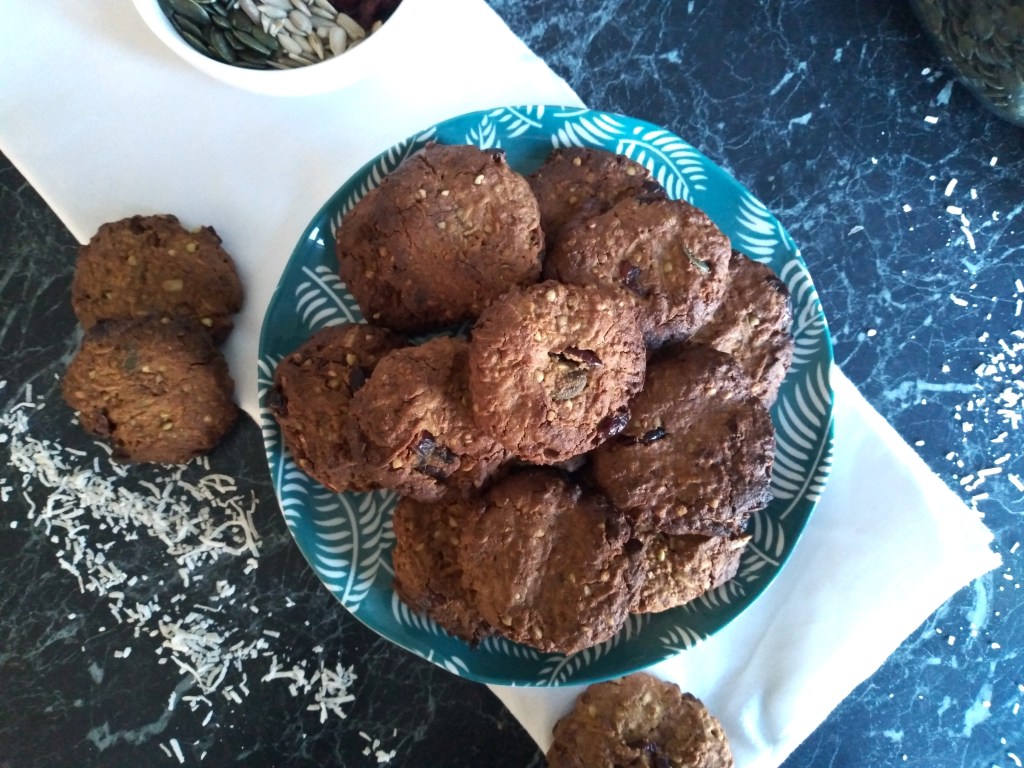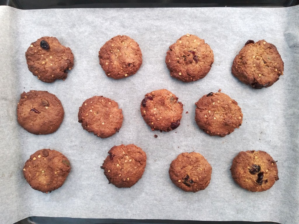 These biscuits (or cookies if you prefer that terminology!) are full of tasty goodness, like cranberries, seeds, coconut, and chocolate chips. They are crispy on the outside and chewy in the middle. This recipe makes about 24 biscuits, depending on how big you make them. The cup measurements below are based on a 250 ml cup as equal to 1 cup, and I recommend that you use the scoop and level method when measuring (spoon the ingredient into the cup measure and then level it off with the back of a spoon or knife, rather than dipping the cup straight into the ingredient). Feel free to mix it up with other add-ins in place of those listed, if you prefer. These well for at least a few days at room temperature in an airtight container.