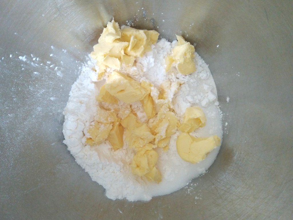 3. Add the butter to the mixing bowl and rub into the dry ingredients that are already in the bowl.