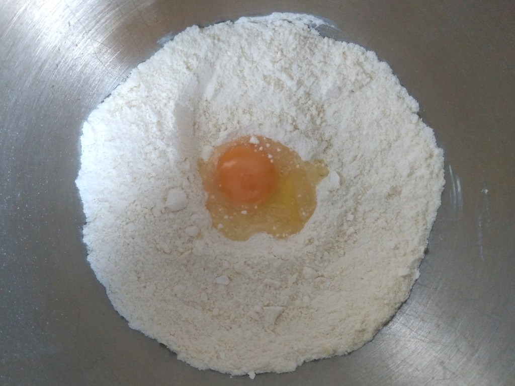 4. Add the egg to the bowl and mix in thoroughly. Depending on the size of your egg, the final mixture might look quite sandy and not very coherent – so long as it will form a ball when you pick up some mixture and squeeze it in your hand, this won’t be a problem. If you’d prefer a more coherent mixture, you can add a second egg, but this will make the layer more biscuity and less shortbready.