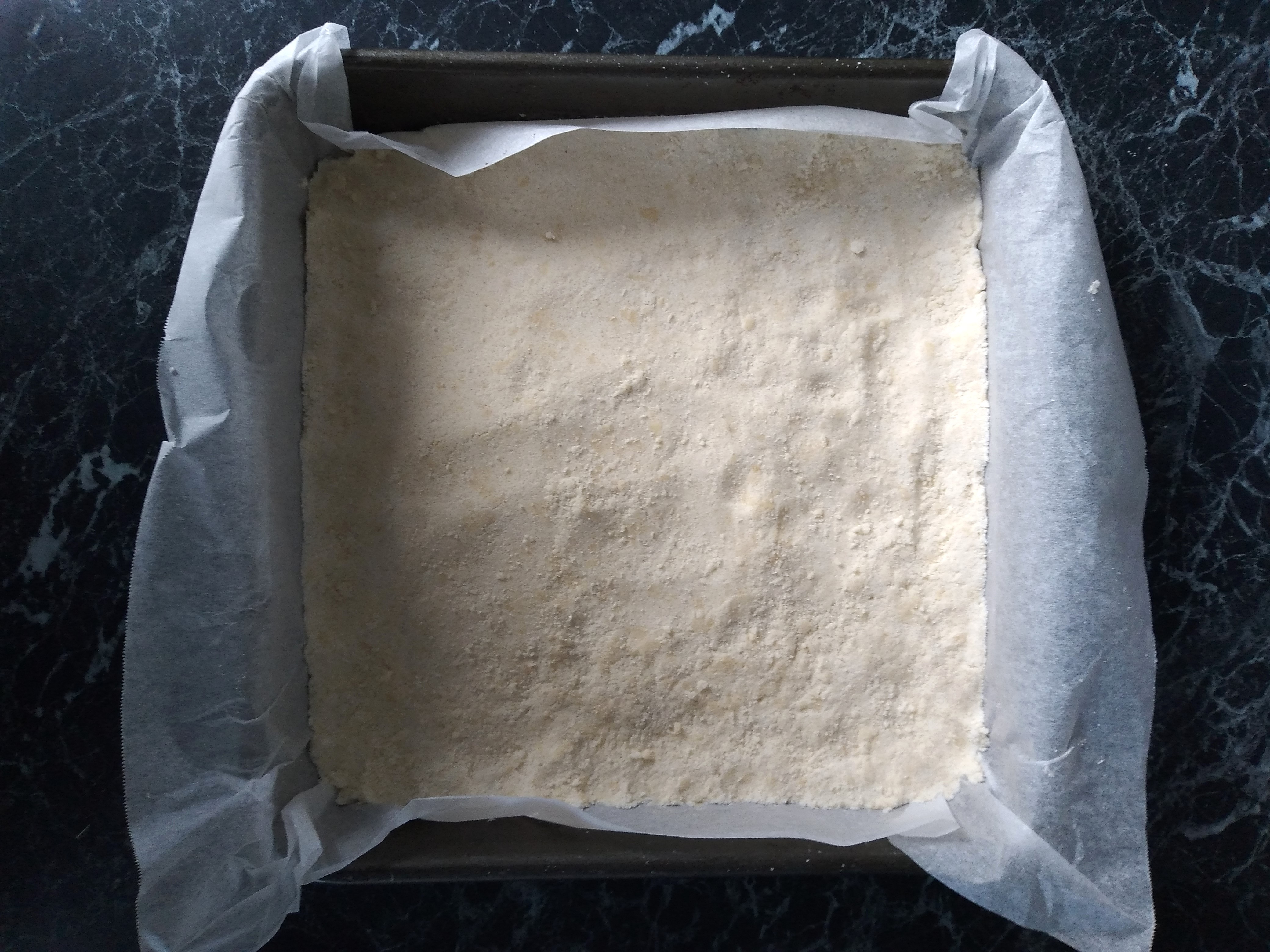 6. Bake the shortbread mixture in the middle of the preheated oven for about 25 minutes or until lightly golden brown.