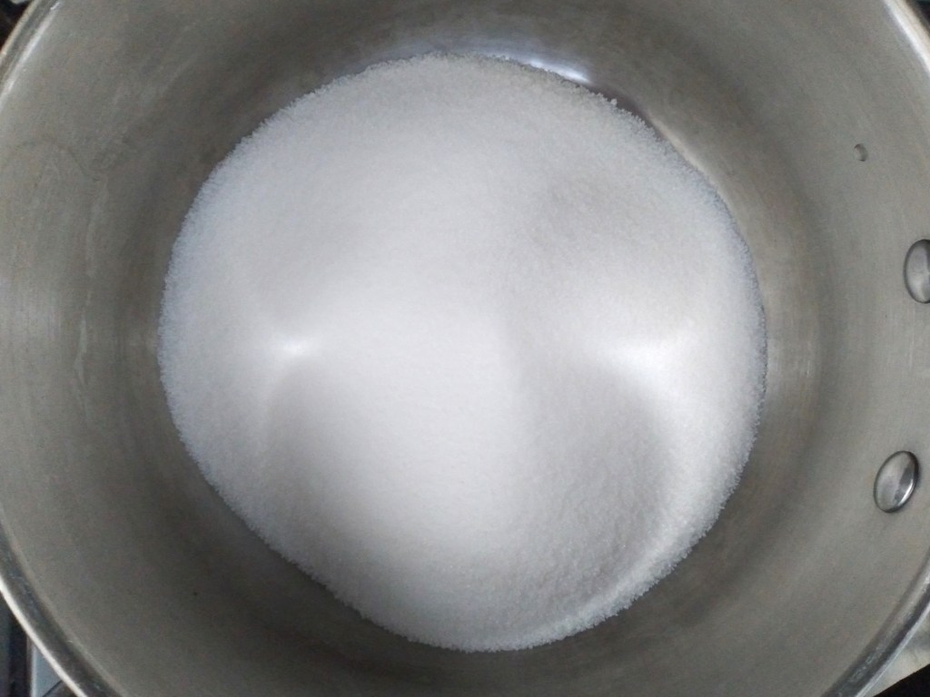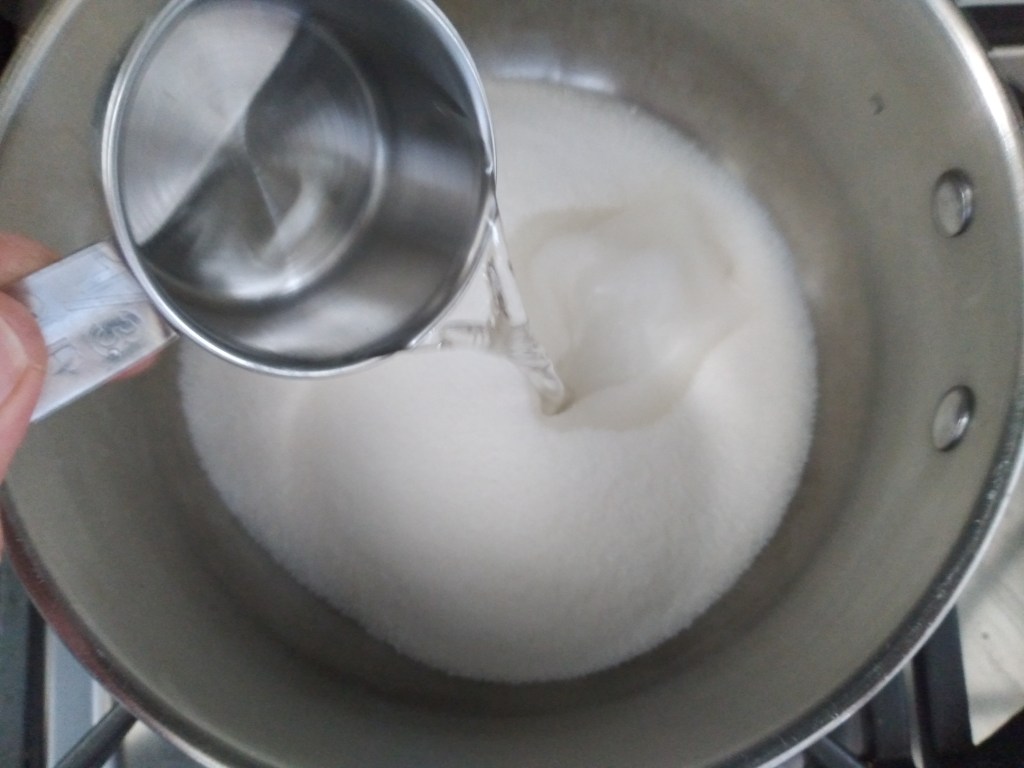 8. To make the caramel layer, place the sugar and water together in a saucepan over a medium heat and gently stir to dissolve the sugar into the water as it melts. Whilst adding the sugar to the saucepan and stirring it, be careful to minimise how much goes on the edges of the pan, instead of just on the bottom, as sugar on the sides may not dissolve completely and may cause the caramel to have a grainy texture.