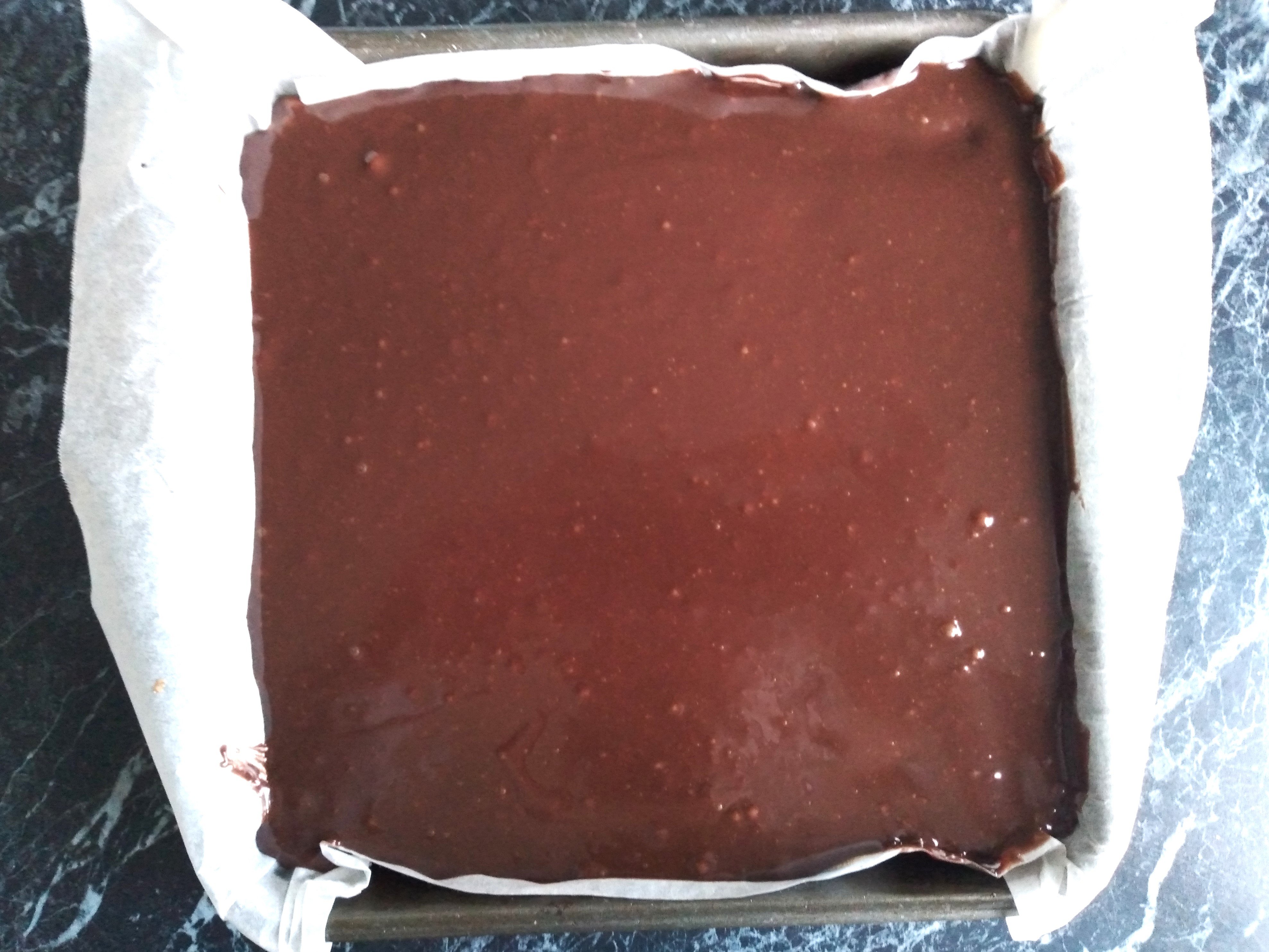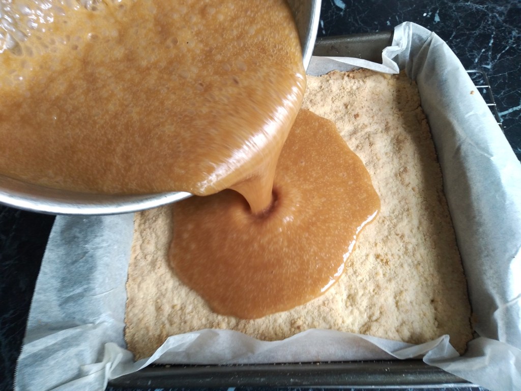 1. Pre-heat the oven to 180°C fan and line a 9 x 9 inch baking pan with baking paper. Using baking paper, rather than greasing the pan, will make it easier to remove the final dish from the pan, once the caramel and chocolate layers have been added and set.