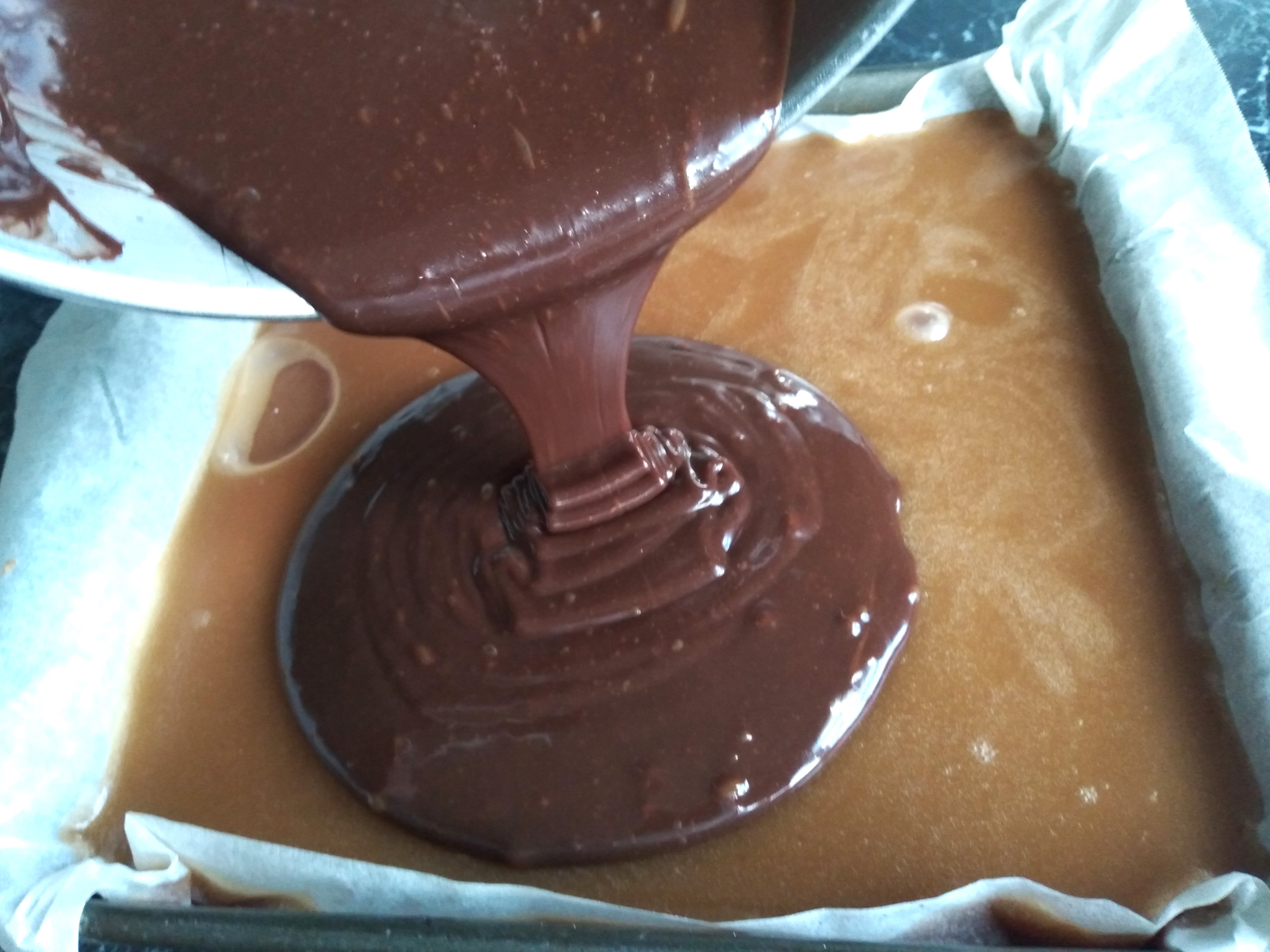 14. Carefully spread the chocolate ganache over the top of the caramel layer (I find a spatula or the back of a spoon best for this) and leave to cool fully (again I put mine in the fridge to speed up this process).