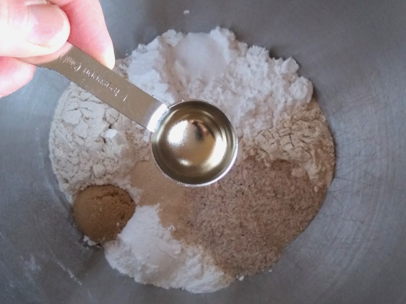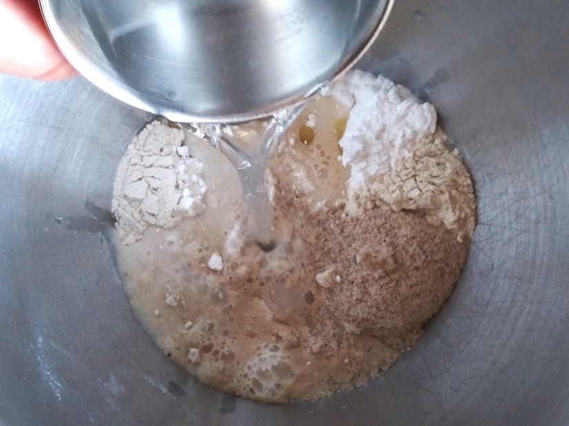 2. Place all the ingredients except the optional seeds together in a large bowl (put the salt and vinegar in the opposite side of the bowl to the yeast, so that they don’t kill the yeast before everything is mixed together).