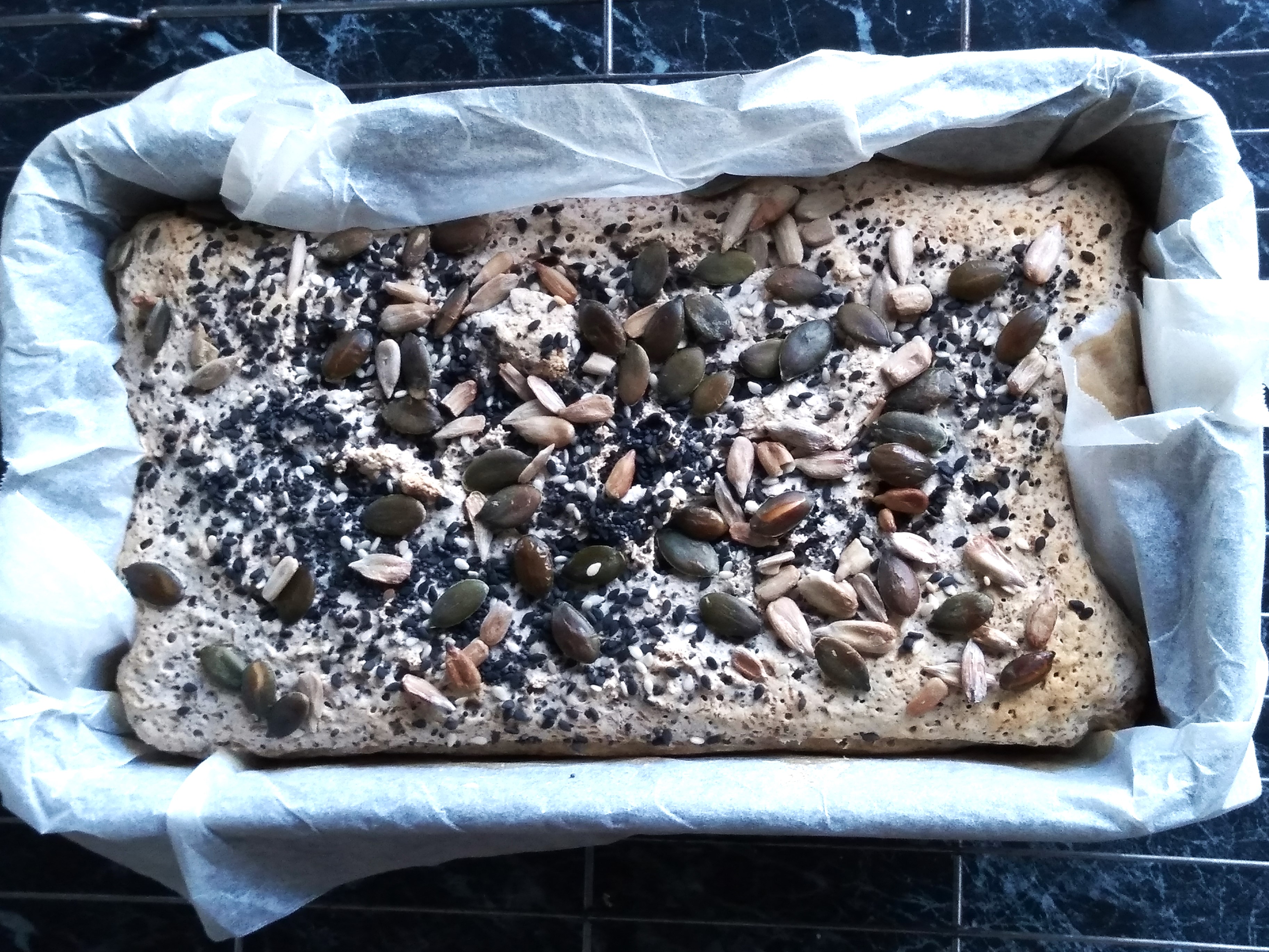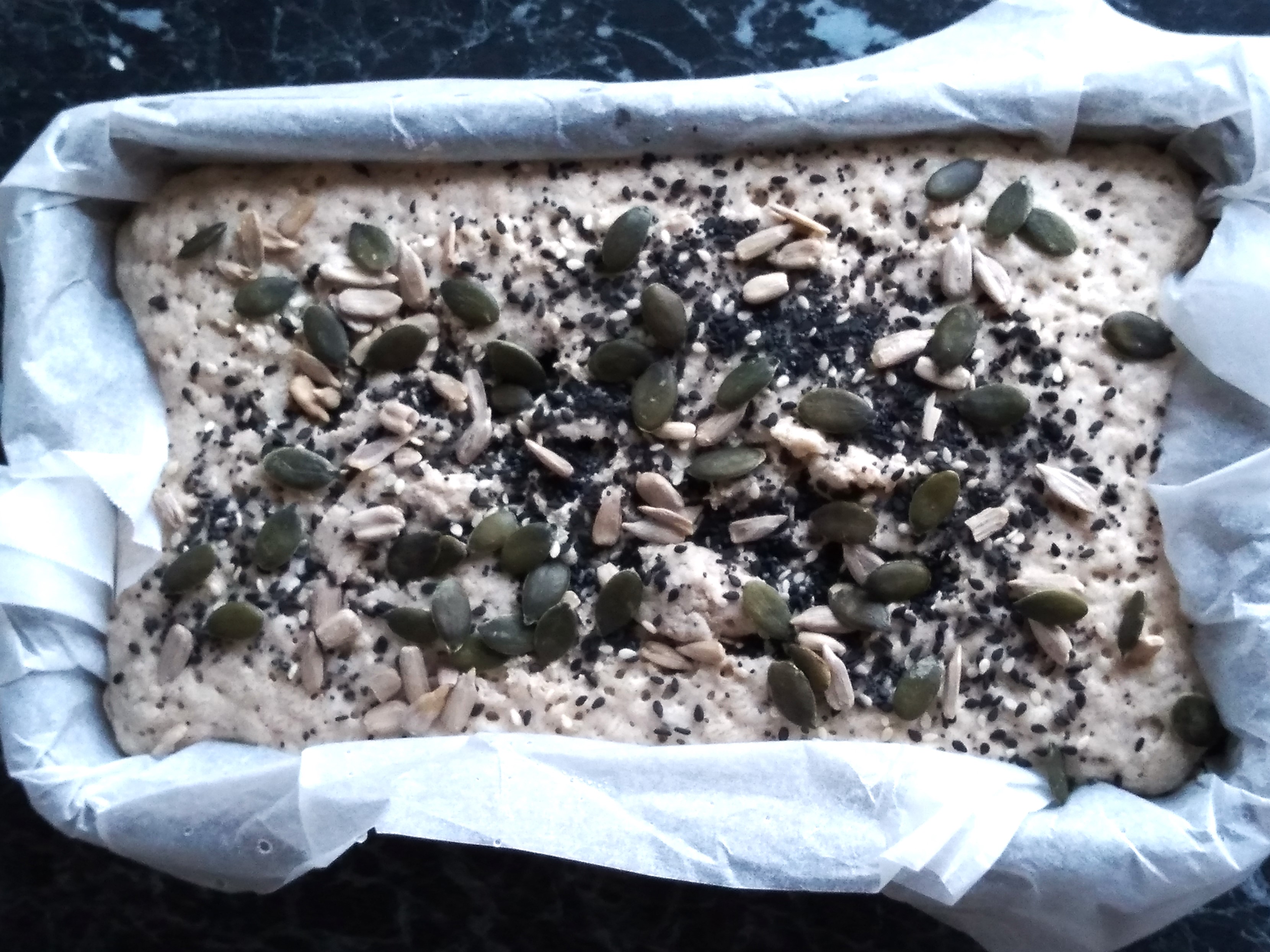 3. Mix all the ingredients together thoroughly until well combined and then tip the dough into the lined loaf tin. Level the top of the dough using a damp hand and sprinkle seeds across the top, if using. I forgot to take a picture of the dough with the seeds on top before it had risen…