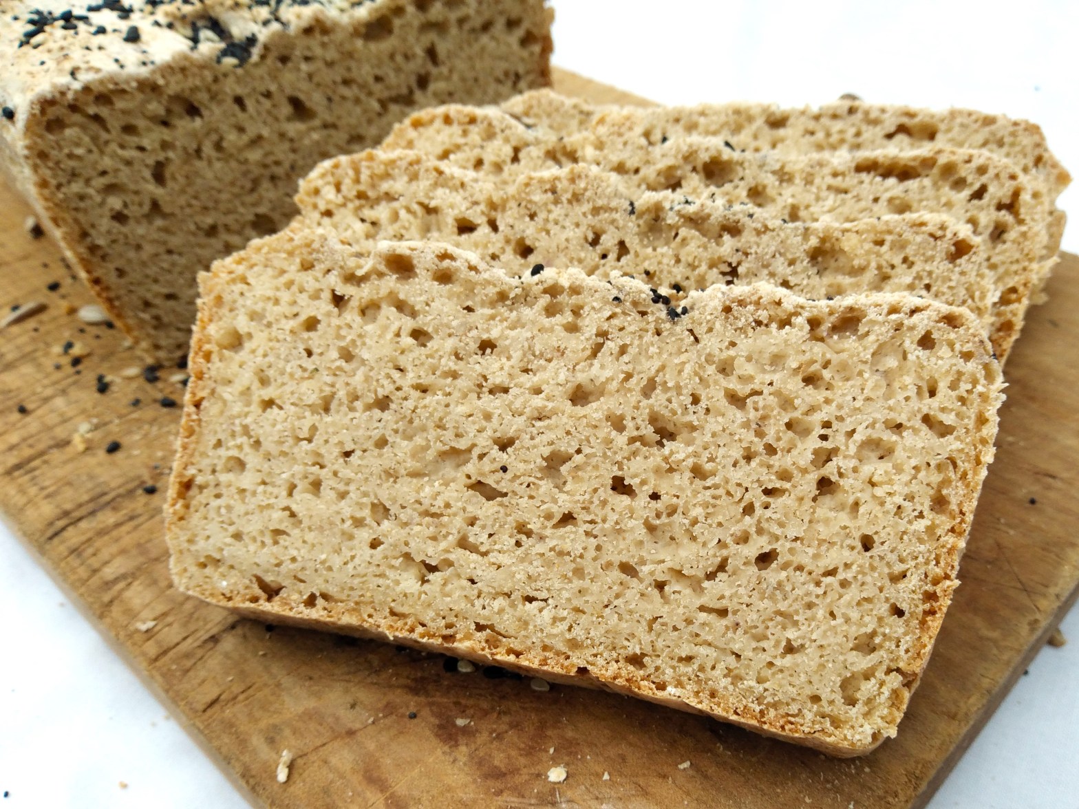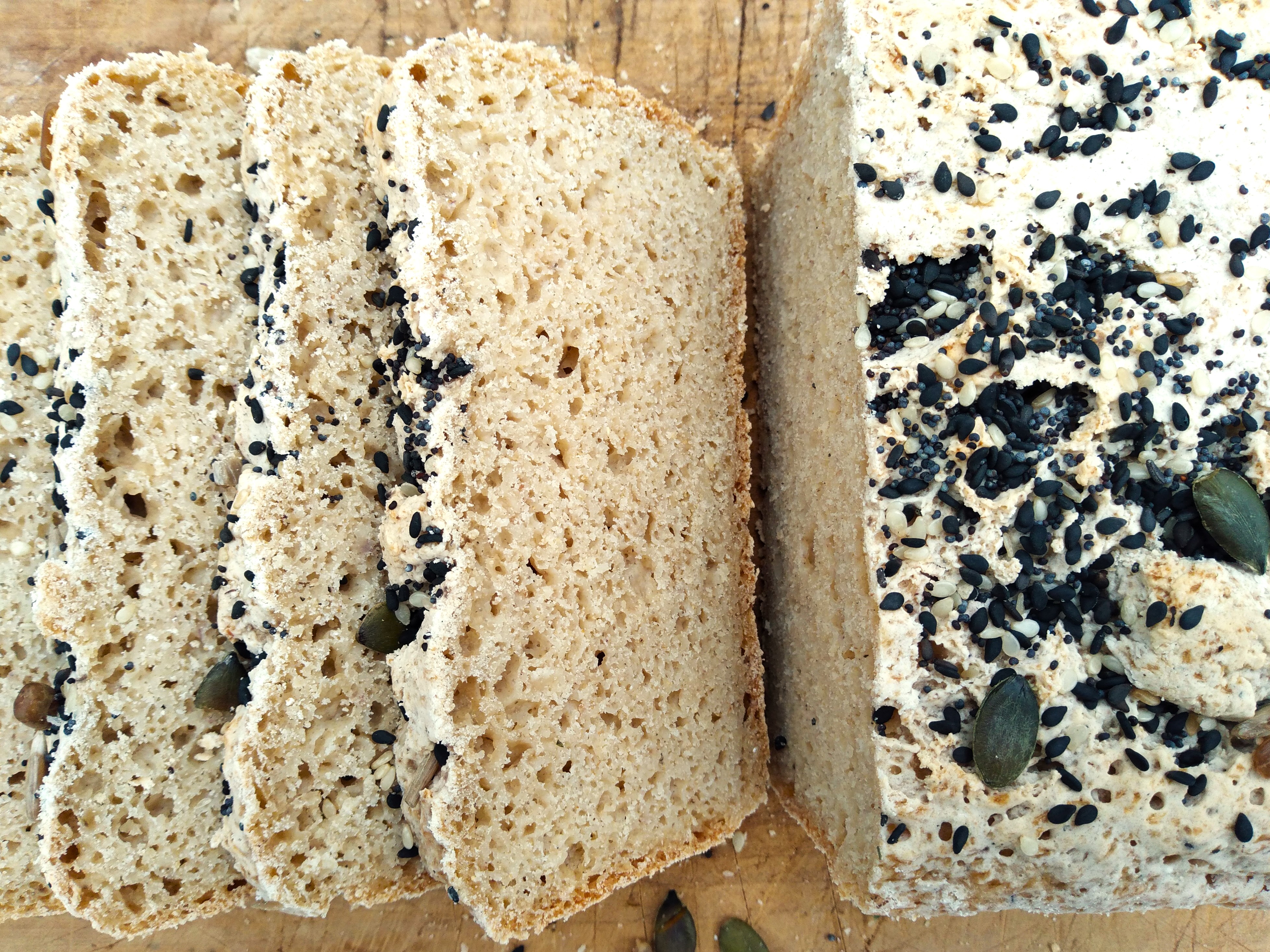 Lately I have been experimenting with different wholegrain flours in my bread-making. I really like the taste and texture that flours such as sorghum, buckwheat, millet and brown rice flour give to gluten free bread. I am finding it interesting getting the right balance between different wholegrain flours, starches and psyllium husk, and sometimes it is hard to decide which combination I like enough to consider it a ‘best’ and write up the recipe to keep. This bread has a fairly high quantity of starch but enough wholegrain flour to give what I would consider a light wholemeal flavour. I have tried substituting the wholegrain flours in this recipe with some success but sometimes need to add extra water or starch, depending on how absorbent the alternative flours I add are – if you come up with an amazingly flavoured or textured bread with a different flour or starch combination, I would love to hear from you!